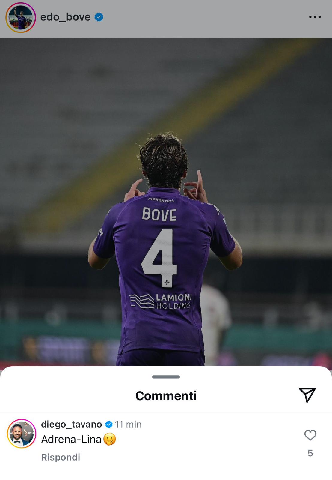 Tra i più apprezzati dal pubblico nel corso della vittoria della Fiorentina sulla Roma, c'è stato Edoardo Bove. Autore anche di un gol, l'ex di turno ha messo in atto una prestazione convincente sotto tutti i punti di vista, uscendo in un tripudio di applausi che il Franchi gli ha riservato al momento della sostituzione. E ad aggiungere una velata stoccata sui social ci ha pensato il suo agente, Diego Tavano: su Instagram infatti, sotto al post del numero 4 viola che celebrava il successo di ieri, lo stesso procuratore ha commentato con scritto "Adrena-Lina", seguito dalla faccina che si cuce la bocca. Il riferimento va a Lina Souloukou, ex CEO della Roma - che si è dimessa dopo l'esonero di De Rossi - che in estate ha portato anche alla cessione dello stesso Bove, con l'entourage che non ha perso l'occasione per ribadirlo così anche pubblicamente.