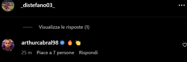 L'esterno della Primavera Filippo Distefano, molto spesso aggregato alla prima squadra, ha postato una foto sui social esultando per la Supercoppa vinta ieri contro l'Inter. Nei commenti, com'è possibile osservare qui sotto, ha applaudito il giovane talento anche Arthur Cabral.
