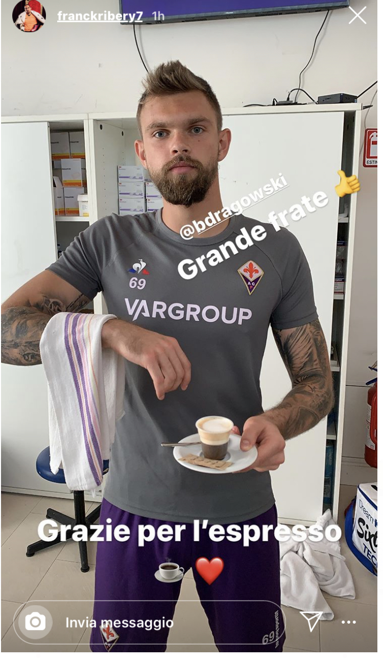 Franck Ribery è sempre più entusiasta della sua avventura a Firenze. A testimoniarlo la stories su Instagram del numero 7 viola che ritrae Bartolomiej Dragowski nel momento in cui gli porta il caffè. Una foto molto simpatica, visibile qui sotto, che ritrae il numero 69 della Fiorentina in una posa da cameriere. Un clima di serenità che si respira ed evidenziato dal "Grande frate" che scrive proprio Ribery come commento dell'immagine.