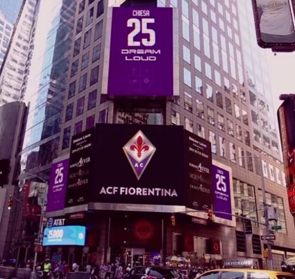 Come vi abbiamo mostrato già ieri (CLICCA QUI), è in corso una campagna di Dream Loud, retrosponsor sulla maglia della Fiorentina, per portare la Viola in suolo americano, più precisamente a New York. Alla base di un grattacielo sito in Times Square, una delle principali piazze della metropoli, c'è infatti lo stemma gigliato, con sopra la maglia di uno dei protagonisti della squadra. E dopo la divisa rossa di Lafont vista ieri, oggi nella grande città statunitense è giorno di... Chiesa. Ecco l'immagine tratta dal profilo social di ACF Fiorentina: