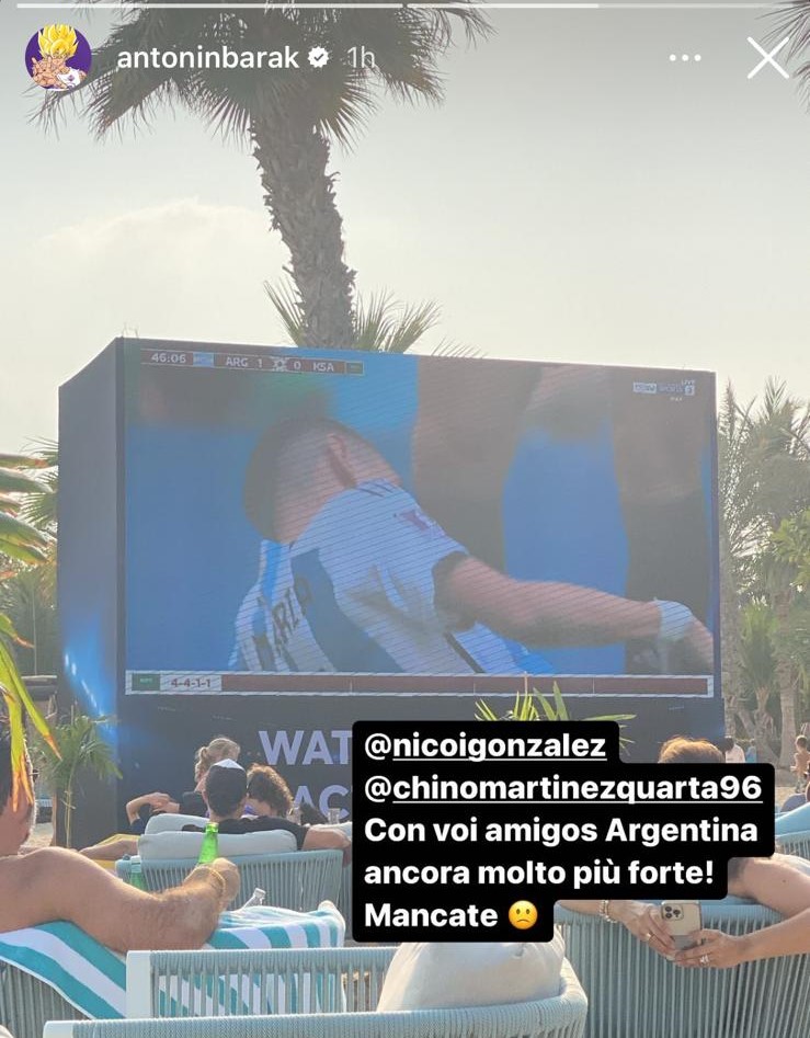 Un Antonin Barak profetico al contrario per l'Argentina e gli amici Martinez Quarta e Nico Gonzalez. Il centrocampista ceco, che si sta godendo gli ultimi giorni di vacanza da una località marittima, ha infatti postato su Instagram un messaggio per i due compagni di squadra sudamericani a Firenze sul punteggio di 1-0 per l'Albiceleste che da lì a poco sarebbe stato ribaltato: "Con voi, amigos, l'Argentina sarebbe stata molto più forte... mancate". Ecco lo scatto che immortala un maxi schermo dal quale l'ex Verona ha assistito alla sconfitta.