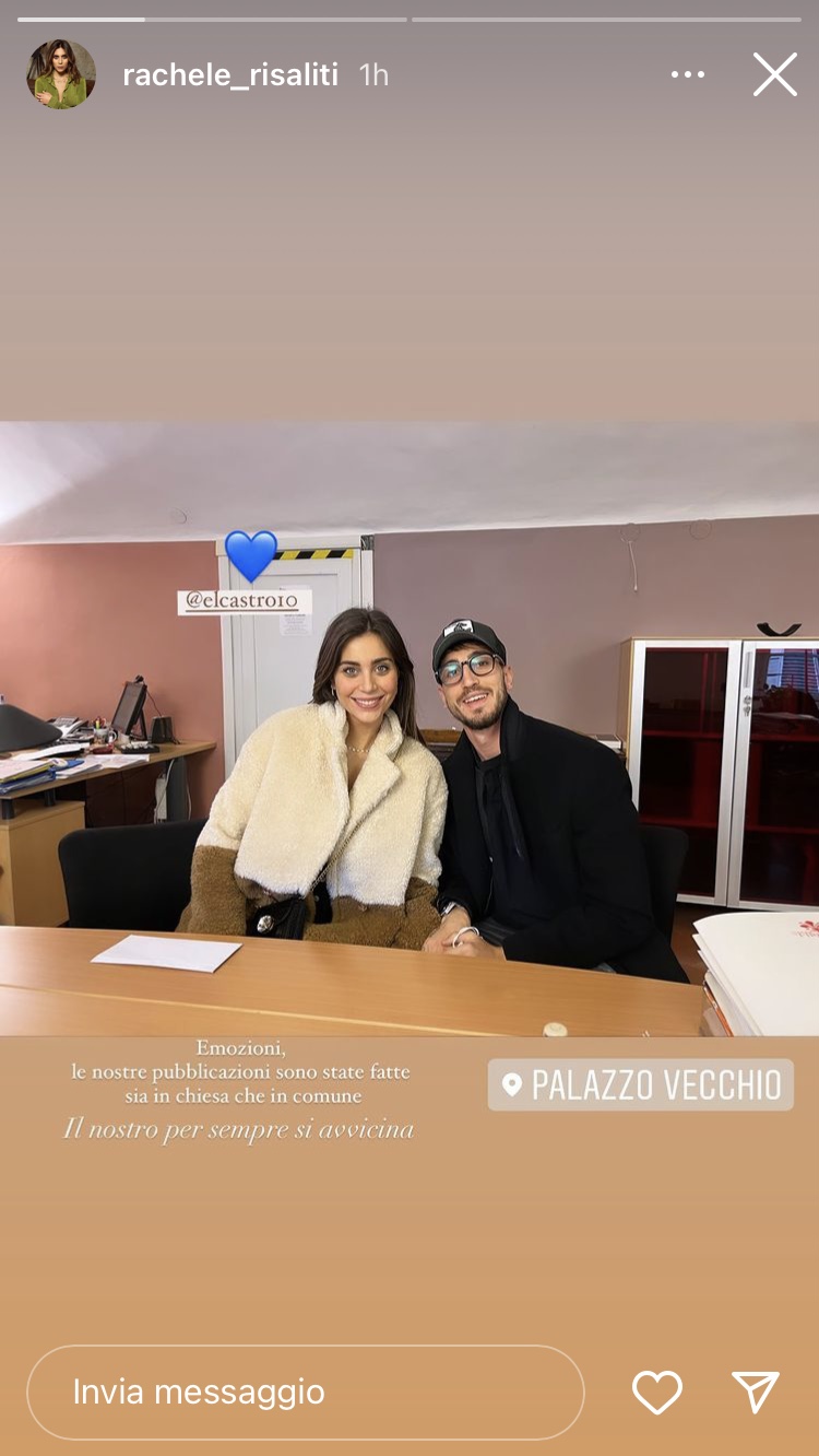 Questa mattina Rachele Risaliti, miss Italia 2016 nonché compagna del centrocampista viola Gaetano Castrovilli, ha pubblicato alcune Instagram Stories assieme al calciatore a Palazzo Vecchio. Il motivo riguarda il loro matrimonio, prossimo ad arrivare: in particolare i due si sono recati in Piazza della Signoria per firmare delle pubblicazioni relative alla cerimonia. Di seguito le immagini in questione: