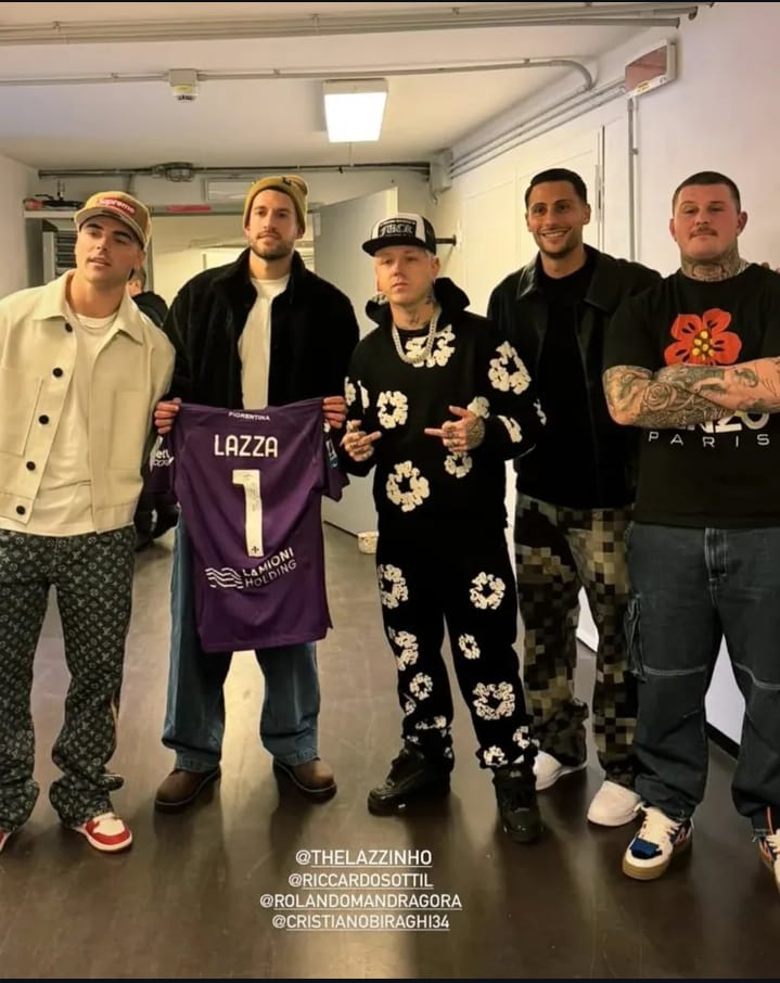 Lazza conquista tutti, anche la Fiorentina. In occasione del concerto del noto rapper italiano al Mandela Forum di Firenze, tra gli ospiti d'eccezione presenti anche tanti calciatori viola. In particolare, Cristiano Biraghi, Edoardo Bove, Rolando Mandragora e Riccardo Sottil: protagonisti sia sugli spalti, dove hanno cantato le hit del rapper milanese, sia nel camerino. Al termine del concerto infatti la "delegazione" viola ha regalato una maglia della Fiorentina al cantante (tifoso milanista). "Lazza 1", la maglia con cui hanno posato insieme in una foto caricata sui social. Lo scatto è stato caricato su Instagram dal pugile e calciante dei Bianchi Andrea Bicchi