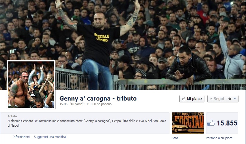 Non una ma ben due pagine facebook dedicate a Genny 'a Carogna. Dopo i fattacci di sabato scorso, quando Hamsik si è recato sotto la curva Nord dell'Olimpico per un colloquio con l'ultras partenopeo, nelle ultime ore è partita una vera e propria celebrazione per Gennaro De Tommaso. Quasi 10.000 like in meno di tre giorni nella prima pagina a lui dedicata, mentre per la seconda, anch'essa nata domenica scorsa, i "mi piace" hanno già superato quota 15.000.