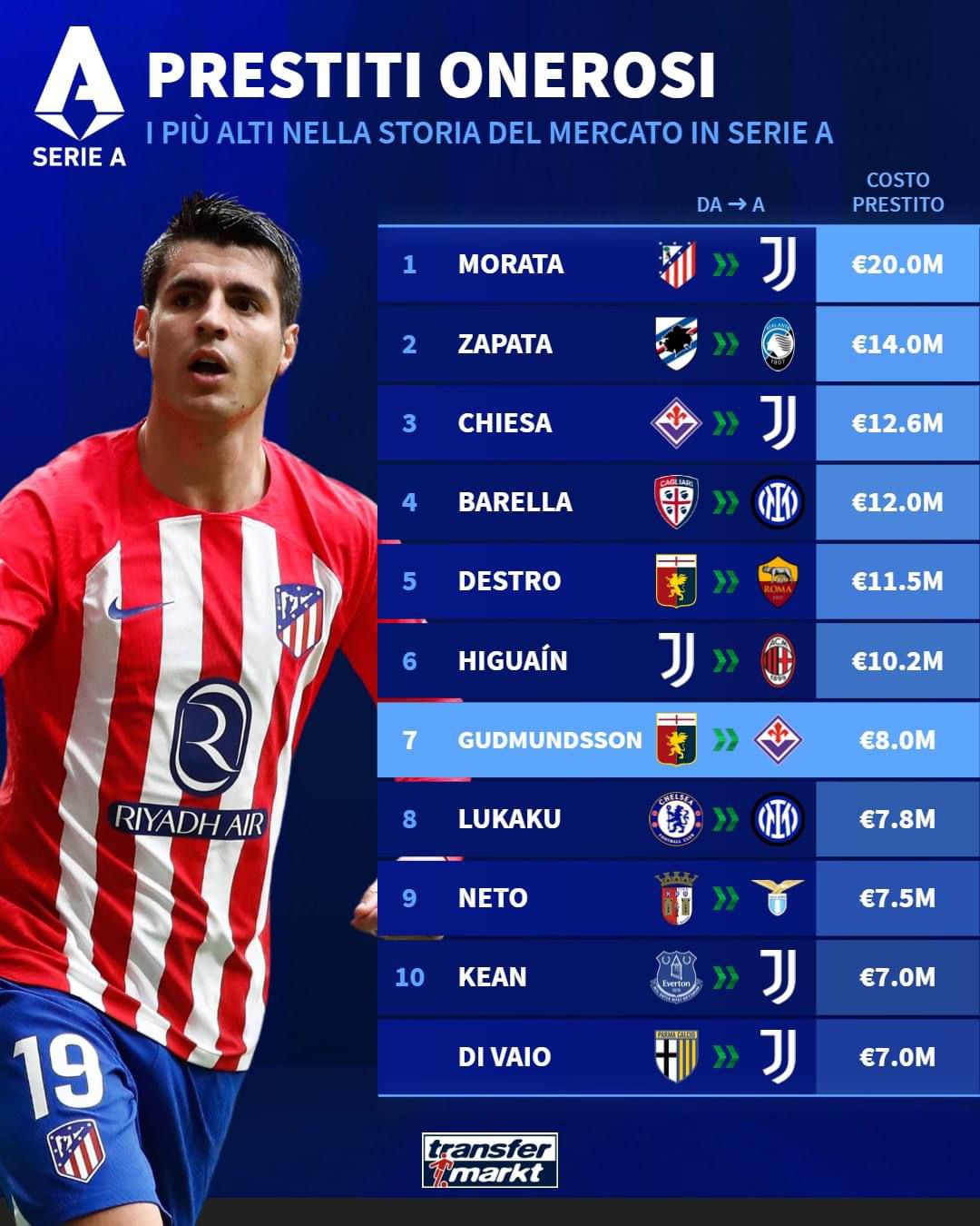Albert Gudmundsson alla Fiorentina è stato un acquisto tra i più cari, come prestito, nella storia del nostro campionato. Come riporta Transfermarkt, l'islandese, nel passaggio dal Genoa ai viola per 8 milioni di euro di esborso, è stato il settimo prestito oneroso più caro nella storia della Serie A. Questa la grafica con la classifica: