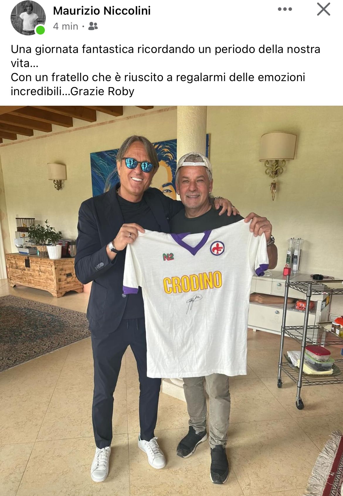Maurizio Niccolini incontra Roberto Baggio. Un'amicizia, quella tra l'attuale caposcout della Fiorentina e l'ex campione viola, che risale proprio ai tempi di Firenze quando, tra fine anni 80 e inizio anni 90 i due si conobbero. A distanza di più di trent'anni, Niccolini e Baggio si sono ritrovati. A testimoniarlo la foto che lo stesso Niccolini, padre tra l'altro del vice di Vincenzo Italiano, Daniel Niccolini, ha postato sul suo profilo Facebook: "Una giornata fantastica ricordando un periodo della nostra vita. Con un fratello che è riuscito a regalarmi delle emozioni incredibili. Grazie Roby". Di seguito la foto coi due ritratti con una maglia 'vintage' della Fiorentina.