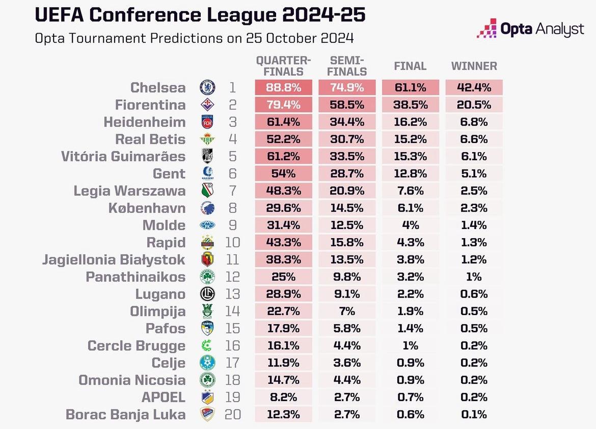 Il portale di analisi dei dati e statistiche Opta Sport ha stimato la possibilità per ogni squadra di vincere la Conference League. In questa speciale classifica la Fiorentina si posiziona al secondo posto, con il 20,5% di possibilità sollevare il trofeo e addirittura 38,5% di arrivare in finale. Ampliamente in vantaggio sulla terza squadra, che per il portale è l'Heidenheim con il 6,8% di possibilità di trionfo e il 16,2% di raggiungere la finale in Polonia. Davanti a tutti c'è ovviamente il Chelsea, che Opta da vincente al 42,4% e finalista al 61,1%.