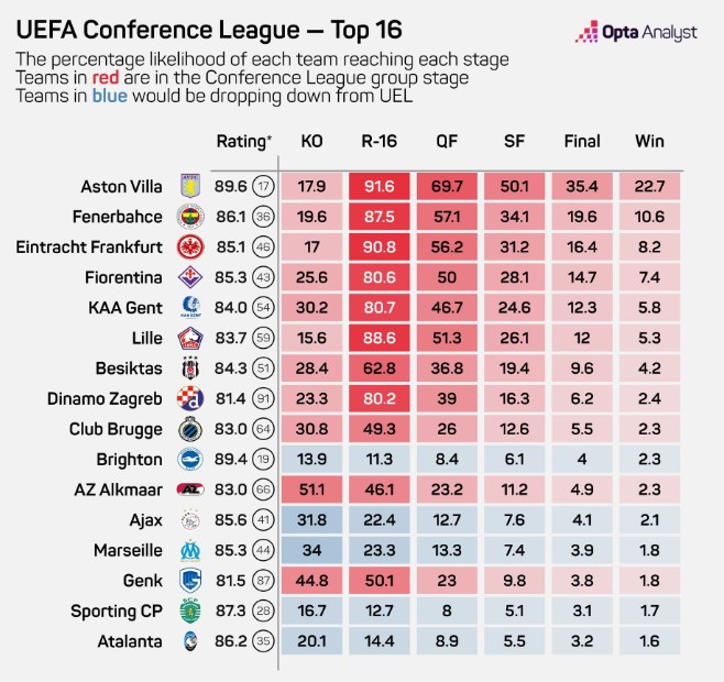 L'analista dell'Opta Nils Mackay, ha stilato una classifica delle sedici squadre più quotate per vincere la Conference League.