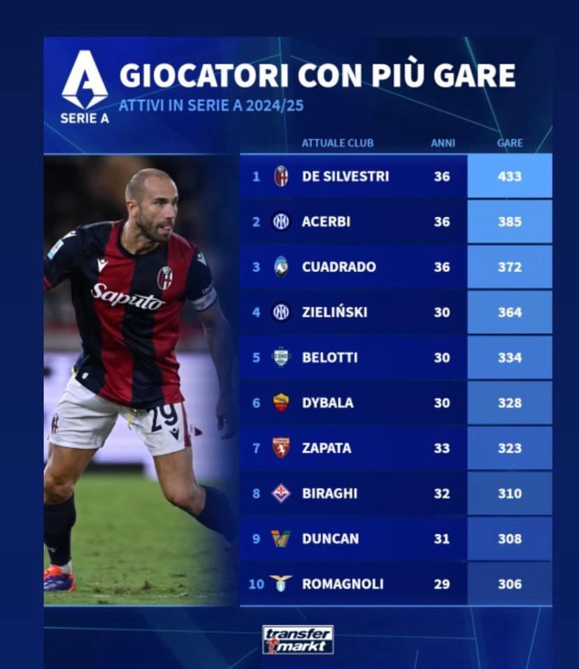 Il portale Transfermarkt ha stilato una classifica curiosa per quanto riguarda i calciatori attivi in serie A più longevi in termini di presenze. Nei primi 10 rientra anche Cristiano Biraghi, capitano viola, all'ottavo posto con 310 presenze. Comanda questa particolare classifica un ex viola come Lorenzo De Silvestri, al secondo posto Acerbi e chiude il podio un altro ex Viola, Cuadrado. Qui sotto la graduatoria.