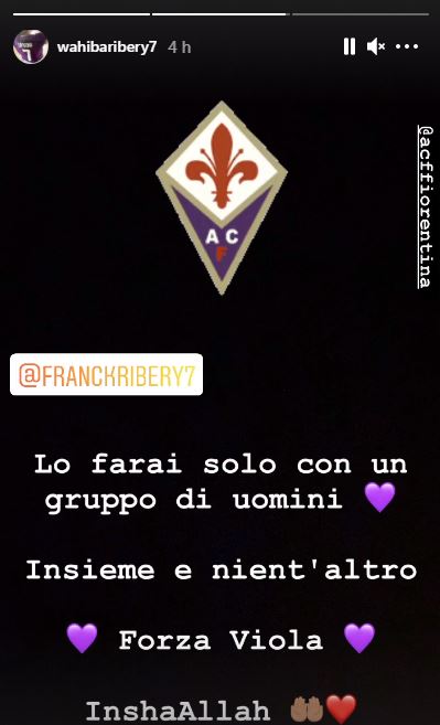 Arriva uno speciale messaggio di supporto per Franck Ribery, al centro del momento difficile che sta vivendo la sua Fiorentina, da parte della moglie Wahiba. Su Instagram, lady Ribery ha infatti condiviso una Stories con lo stemma gigliato dei viola al centro, e una didascalia: "Lo farai ("ce la farai", ti rialzerei, ndr) solo con un gruppo di uomini. Insieme e nient'altro, forza viola!". Di seguito l'immagine tratta dai social.
