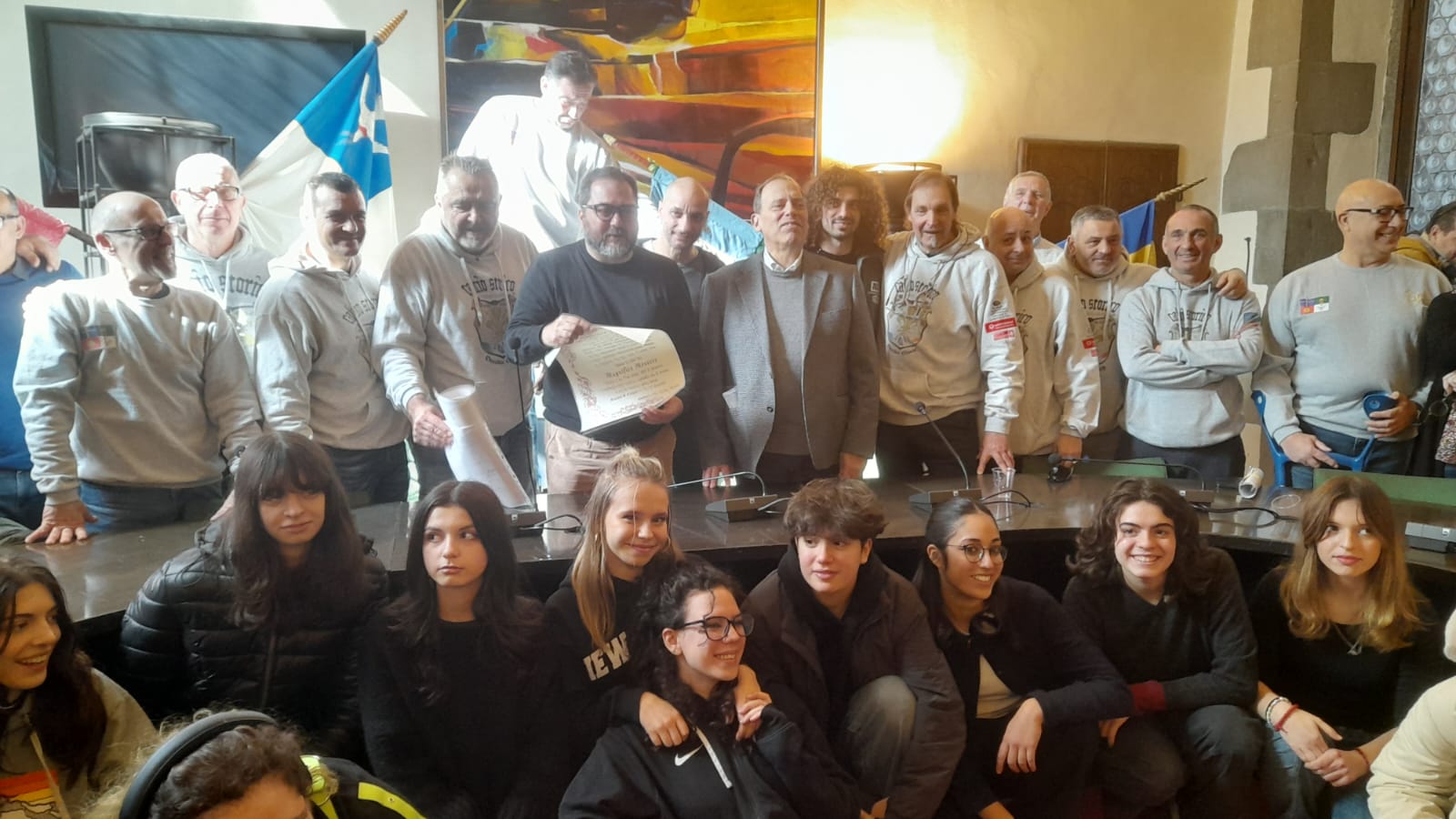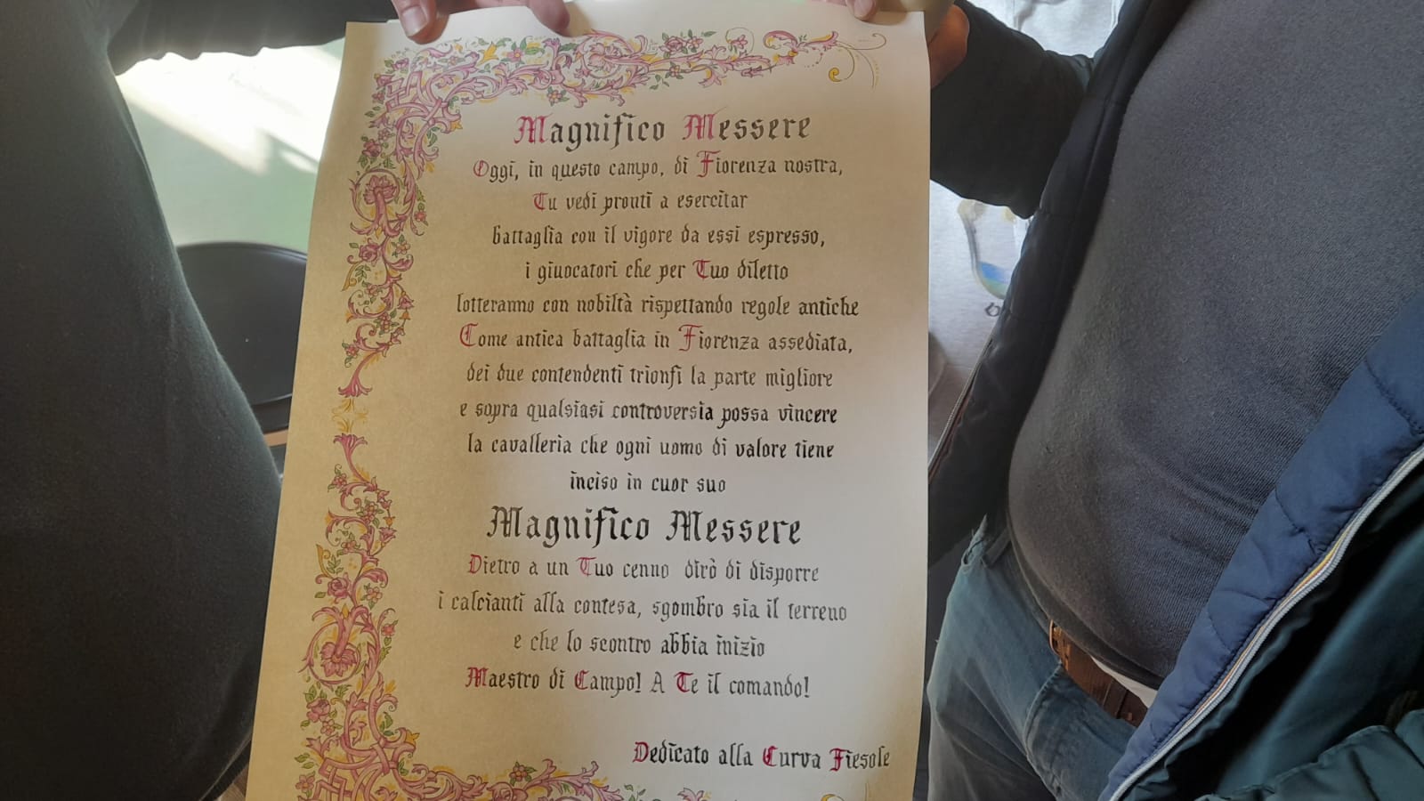 Stamani è stato presentato l'evento, in conferenza stampa dalla Sala Macconi di Palazzo Vecchio. Da sottolineare anche l'iniziativa raccolta dalla classe 3F del Liceo Artistico Alberti Dante, scrivendo la pergamena che verrà letta sabato ai Magnifici Messeri prima della partita. Quest'ultimi saranno dei rappresentanti della Curva Fiesole, interpellata per l'occasione dopo il grande aiuto portato dalla tifoseria ai Comuni alluvionati lo scorso mese di novembre. FirenzeViola.it era presente alla conferenza, di seguito gli scatti eseguiti sul posto che immortalano il Presidente del Calcio Storico e del Quartiere 2, Michele Pierguidi, gli studenti della classe sopra citata e gli ex calcianti coinvolti: