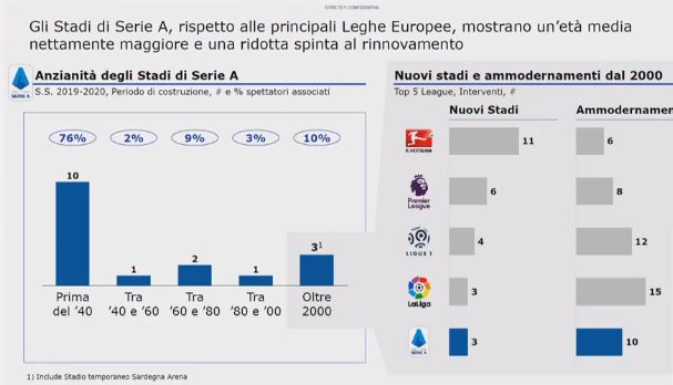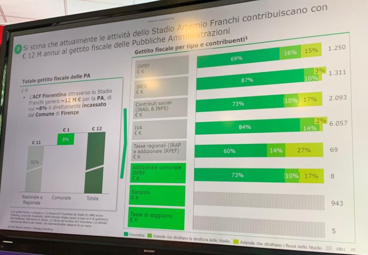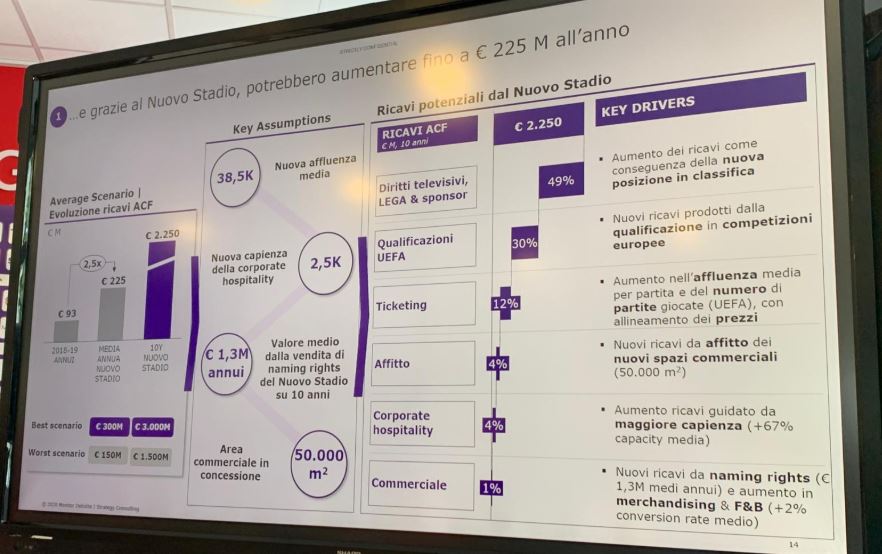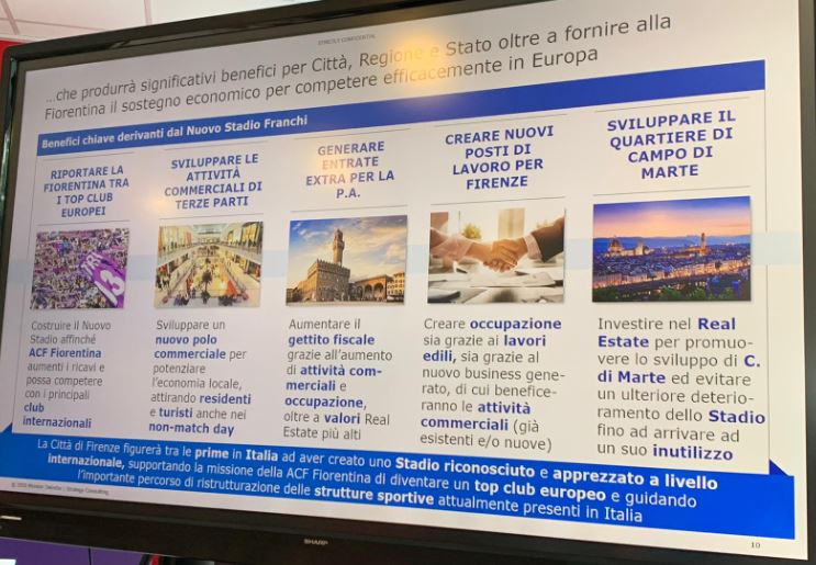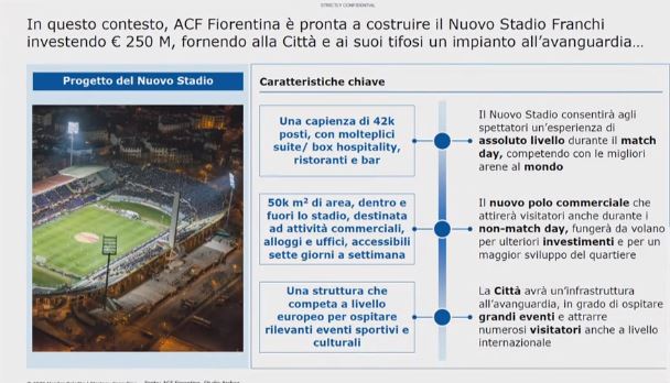 Direttamente dalla Rinascente Lounge dello Stadio Artemio Franchi, ha luogo una conferenza stampa di presentazione dello Studio degli impatti economici, effettuato da Monitor Deloitte | Strategy Consulting, in caso di costruzione di un Nuovo Stadio da edificare al posto dell’attuale impianto. Queste le dichiarazioni del presidente viola Rocco Commisso: "Abbiamo Deloitte, una delle più grandi associazioni di consulenze nel mondo. Luigi Capitanio, direttore, vi spiegherà l'analisi che abbiamo fatto. L'Italia è quinta per ricavi, nei diritti siamo ultimi: 40 milioni a squadra, la Liga 45 e la Premier 110. Grande differenza. Le squadre che hanno fatto il loro stadio, come il Manchester City, che era grande quanto la Fiorentina, oggi è a 611 milioni di ricavi. La Juventus è passata da 200 milioni a 460. Avendo studiato analisi correlativa, so che i ricavi di una squadra sono collegati al successo sul campo. Noi non siamo andati in Champions né in Europa League, ma non abbiamo nemmeno uno stadio nuovo. In America le squadre di calcio hanno cominciato ad essere spostate da uno stato ad un altro, come i New York Giants che ora sono i San Francisco Giants. In 40/50 anni lo Yankee Stadium, il più importante in America, è stato distrutto, è costato 2,3 miliardi di dollari, di cui 1,4 fornito dal governo. Dagli errori si impara, quindi l'hanno mantenuto nel Brox: in quaranta anni è stato rifatto. Nella MLS, prima di entrarci serve pagare 300 milioni di dollari e in più devi portare lo stadio con te. E che fanno questi grandi club? Chiedono aiuto allo stato, così diminuiscono i costi ma le città prendono le squadre. Stanno uscendo porcherie, i politici si stanno mettendo avanti. Sto parlando della Di Giorgi (QUI LA NOSTRA ESCLUSIVA!): mettete voi i soldi e fate come volete voi, con i migliori architetti del mondo. Con i miei soldi, si fa quello che voglio io. Come a Firenze, potevo mettere i miei soldi a New York: abbiamo fatto tutto questo progetto di due mesi, così che la città impari che ci sono costi e benefici. Non venitemi a dire chi comanda me!".