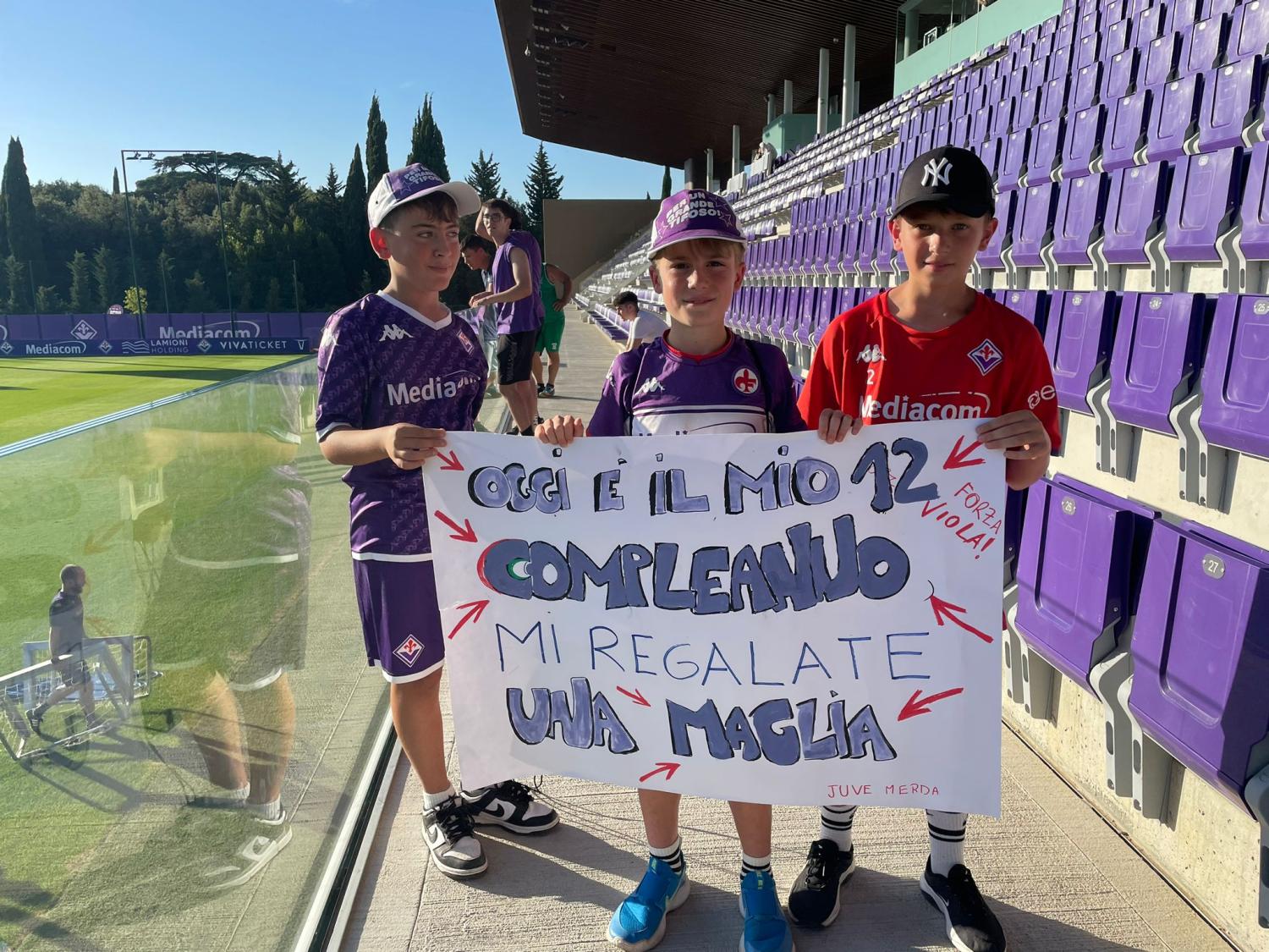 Spunta anche una richiesta particolare tra i presenti al Viola Park per seguire l'allenamento a porte aperte della Fiorentina. Come mostra l'immagine in calce scattata dai nostri inviati, tra i tanti bambini al centro sportivo di Bagno a Ripoli, c'è qualcuno che ha rivolto una strana e divertente richiesta ai calciatori viola: con un piccolo cartellone, la scritta "Oggi è il mio 12° compleanno, mi regalate una maglia?" accompagna l'affettuosa richiesta fatta da tre piccoli, ritratti nella foto in calce all'articolo, nella speranza che qualche giocatore di Palladino possa accontentarli.