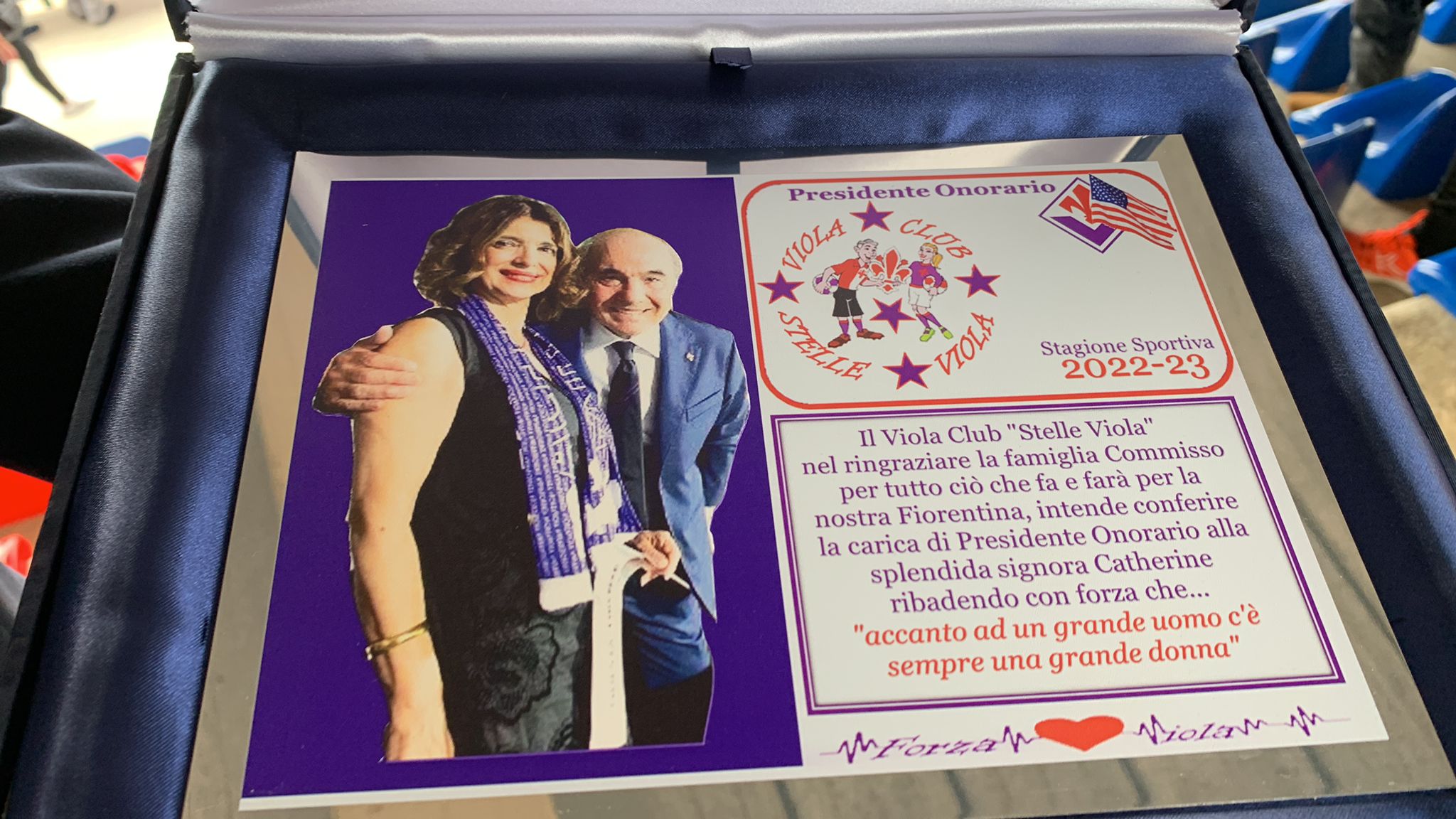 Allo stadio Torrini, quest’oggi, in occasione della sfida tra Fiorentina Femminile e Sampdoria, è presente il presidente Rocco Commisso insieme alla moglie Catherine. Il Viola Club Stelle Viola, viola club dei sostenitori del femminile il cui presidente è Jacopo Uccelli, ha deciso di premiare la moglie del presidente viola con una targa, una maglia e un mazzo di fiori. Questa la foto del premio realizzata dagli inviati di FirenzeViola: