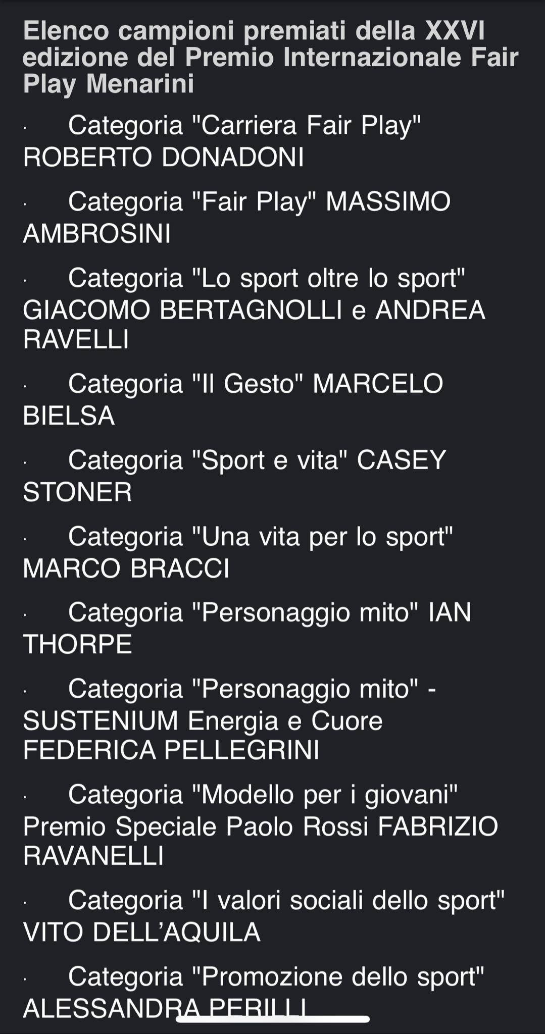 Serata di grande sport a Palazzo Vecchio, dove si è tenuta la 26esima edizione del Premio Fair Play Menarini. Tanti i premiati, dal riconoscimento alla carriera per l'allenatore Roberto Donadoni fino a Massimo Ambrosini per la categoria "fair play" passando anche per Marcelo Bielsa (nella categoria "Il Gesto") ma anche a protagonisti di altri sport come il motociclista Casey Stoner o i nuotatori Federica Pellegrini e Ian Thorpe. Presenti tante personalità del settore, come per esempio il giornalista Ivan Zazzaroni o Silvia Salis, ex lanciatrice del martello oggi al CONI.