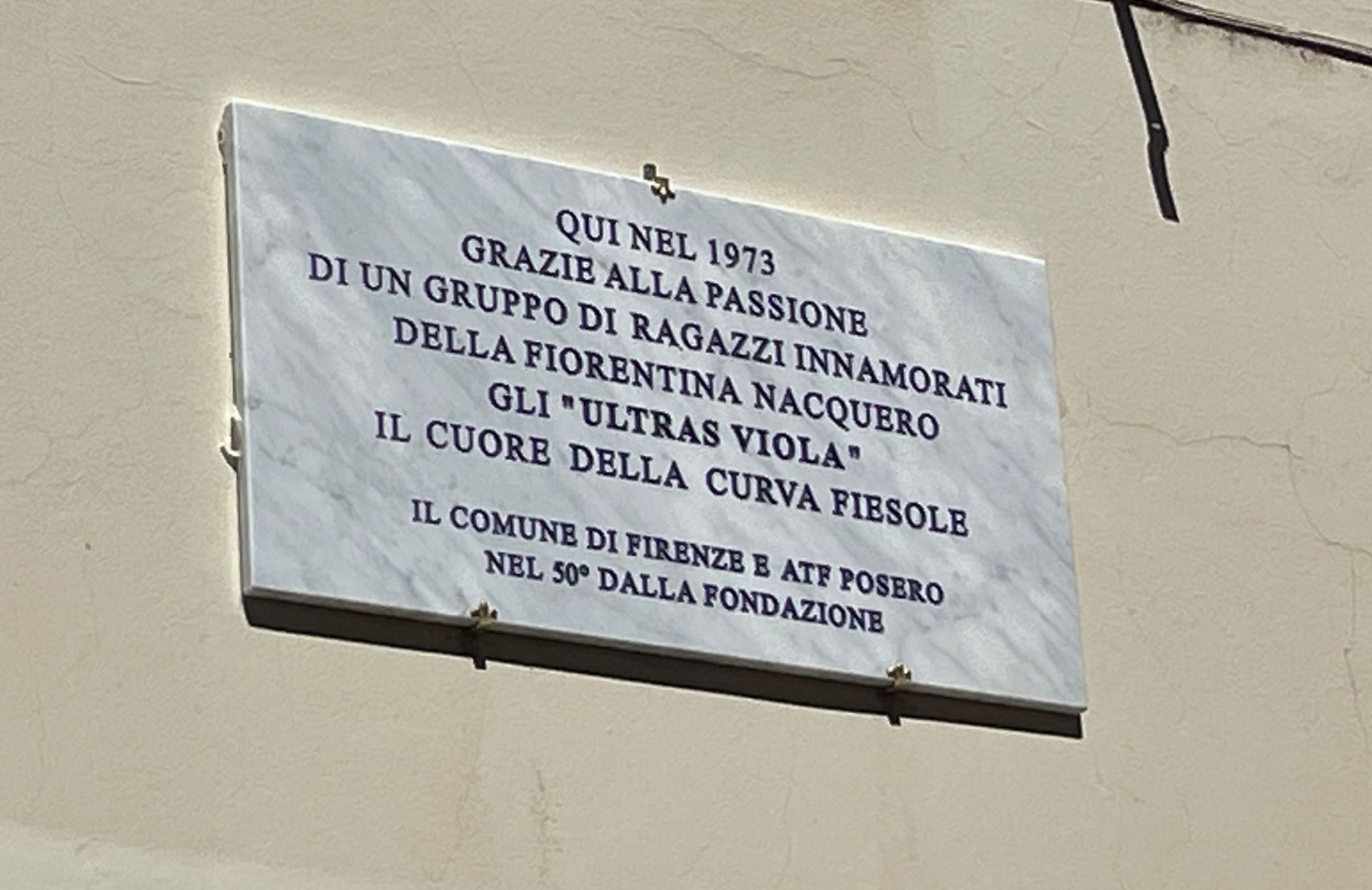 E' stata posta oggi, in via Pisana, una targa (prima e unica in Italia) in ricordo della fondazione dello storico gruppo di tifosi viola "Ultras". Nell'occasione, che chiude le celebrazioni per i 50 anni della Curva Fiesole, oltre a volti noti del tifo che diedero vita al primo gruppo organizzato di quella che oggi è conosciuta come la Curva Fiesole, sono intervenuti il presidente della Regione Toscana Eugenio Giani, l'Assessore allo Sport del Comune di Firenze Cosimo Guccione e il presidente della commissione sport del Comune di Firenze, Fabio Giorgetti. Applausi e fumogeni da parte dei tanti tifosi viola intervenuti nel ricordo dei primi Ultras della Fiorentina e dello storico tifoso viola Stefano Biagini detto il "Pompa".