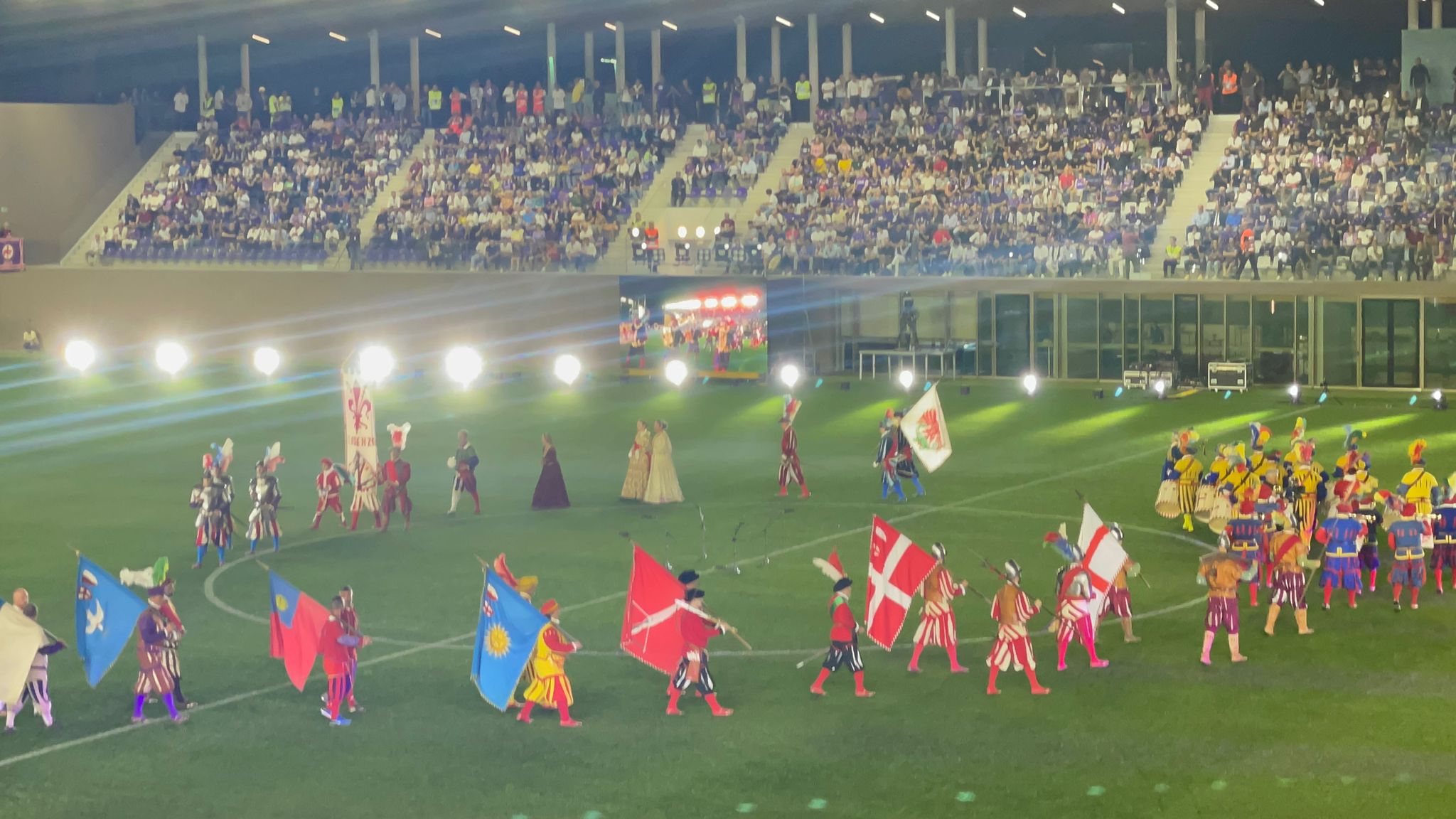 E' inziata la cerimonia di inaugurazione allo stadio Curva Fiesole all'interno del Viola Park. In questo momento sul terreno di gioco, come mostrano i video realizzati da FirenzeViola, ci sono gli sbandieratori e molti figuranti della Repubblica fiorentina. Qui sotto le immagini della cerimonia d'apertura.