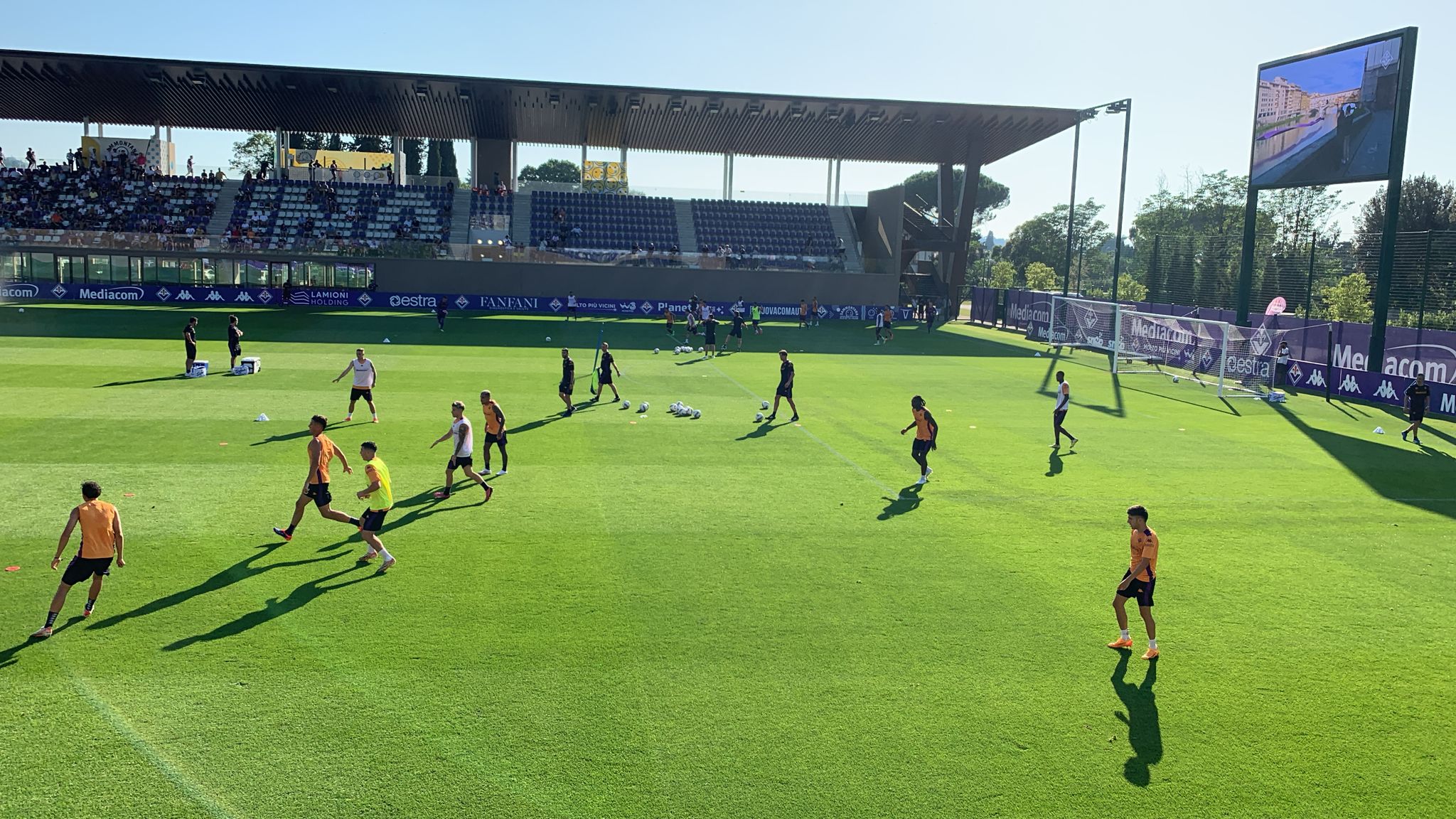 Prosegue la sessione d'allenamento al Viola Park con la corsa in mezzo al campo. La squadra è stata ancora divisa in due gruppi ai lati dell'area di rigore sotto il maxischermo. Due possessi palla a colori con un giocatore in mezzo a fare il jolly, mentre i portieri fungono da sponde ai bordi del quadrato.