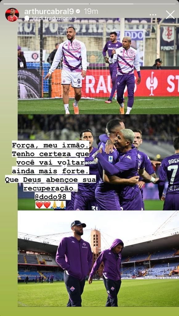Anche Arthur Cabral mostra vicinanza a Dodo per l'infortunio rimediato. Il connazionale ed ex compagno del terzino destro viola ha pubblicato una foto sul suo profilo Instagram dove gli augura una pronta guarigione e di tornare più forte di prima. Qui sotto lo scatto quando ancora Cabral vestiva la maglia della Fiorentina, insieme al suo amico Dodo.