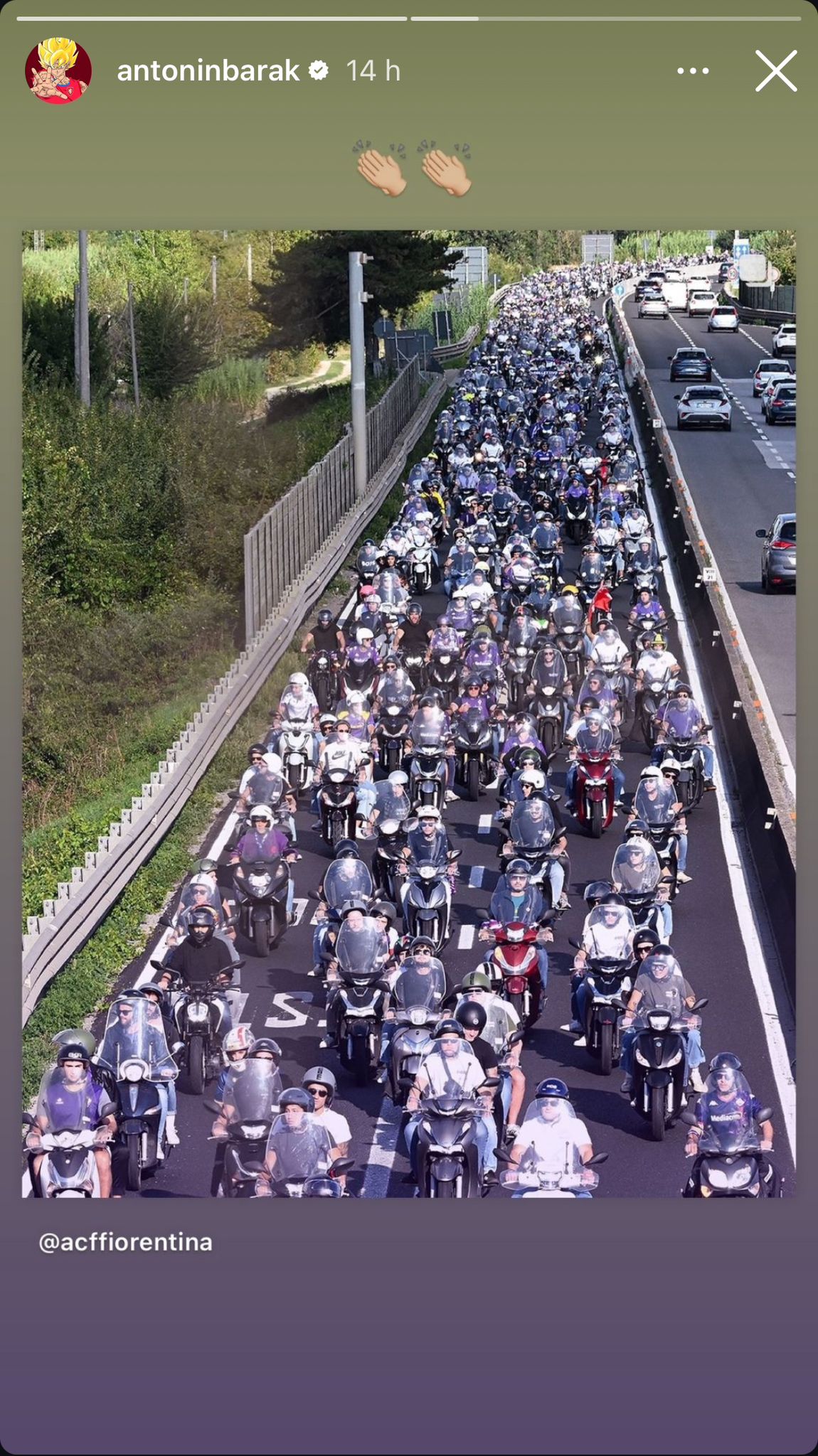Ancora non è decollata la sua esperienza al Kasimpasa, ma dalla Turchia Antonin Barak manifesta vicinanza al popolo viola: il centrocampista ceco, ceduto in prestito a fine mercato, ha condiviso qualche ora fa la foto del 'fiume' di motorini che ha accompagnato la Fiorentina nella trasferta di Empoli. Una marea viola che ha esaltato anche lo stesso Barak, fino a questo momento tre presenze al Kasimpasa, che ha commentato la foto "applaudendo" i suoi ex tifosi attraverso le proprie storie Instagram.