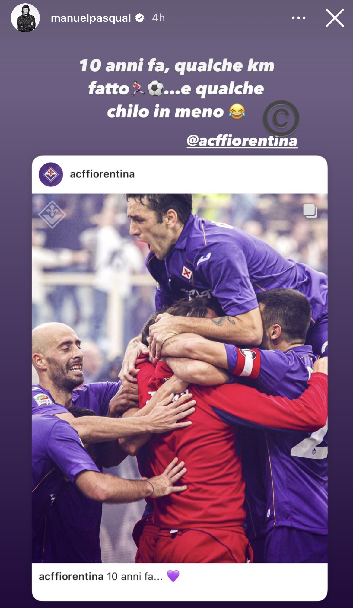 Anche l'ex capitano della Fiorentina, Manuel Pasqual, tramite le proprie storie Instagram, ha voluto omaggiare i 10 anni dalla splendida rimonta contro la Juventus, scrivendo: "10 anni fa, qualche km fatto.. e qualche chilo in meno". Di seguito la storia dell'ex terzino viola: