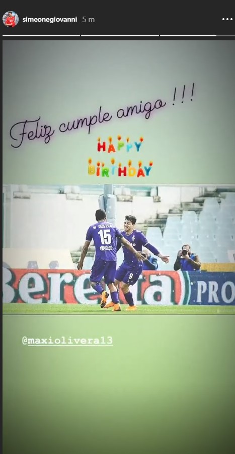 Anche il capitano della Fiorentina, German Pezzella, e Giovanni Simeone non hanno perso occasione per fare gli auguri al loro ex compagno in viola Maxi Olivera attraverso una storia Instagram sul loro profilo ufficiale. Ecco di seguito quanto postato dai due argentini.