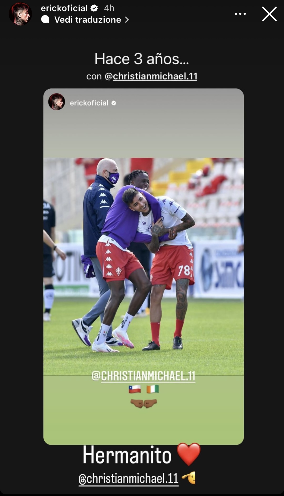 L'ex centrocampista della Fiorentina, Erick Pulgar, ha condiviso sulle proprie storie Instagram una foto ricordo di tre anni fa in maglia viola, nella quale scherza con l'amico Christian Kouame, aggiungendoci la scritta: "Hermanito", ovvero "Fratellino". Di seguito la storia del cileno:
