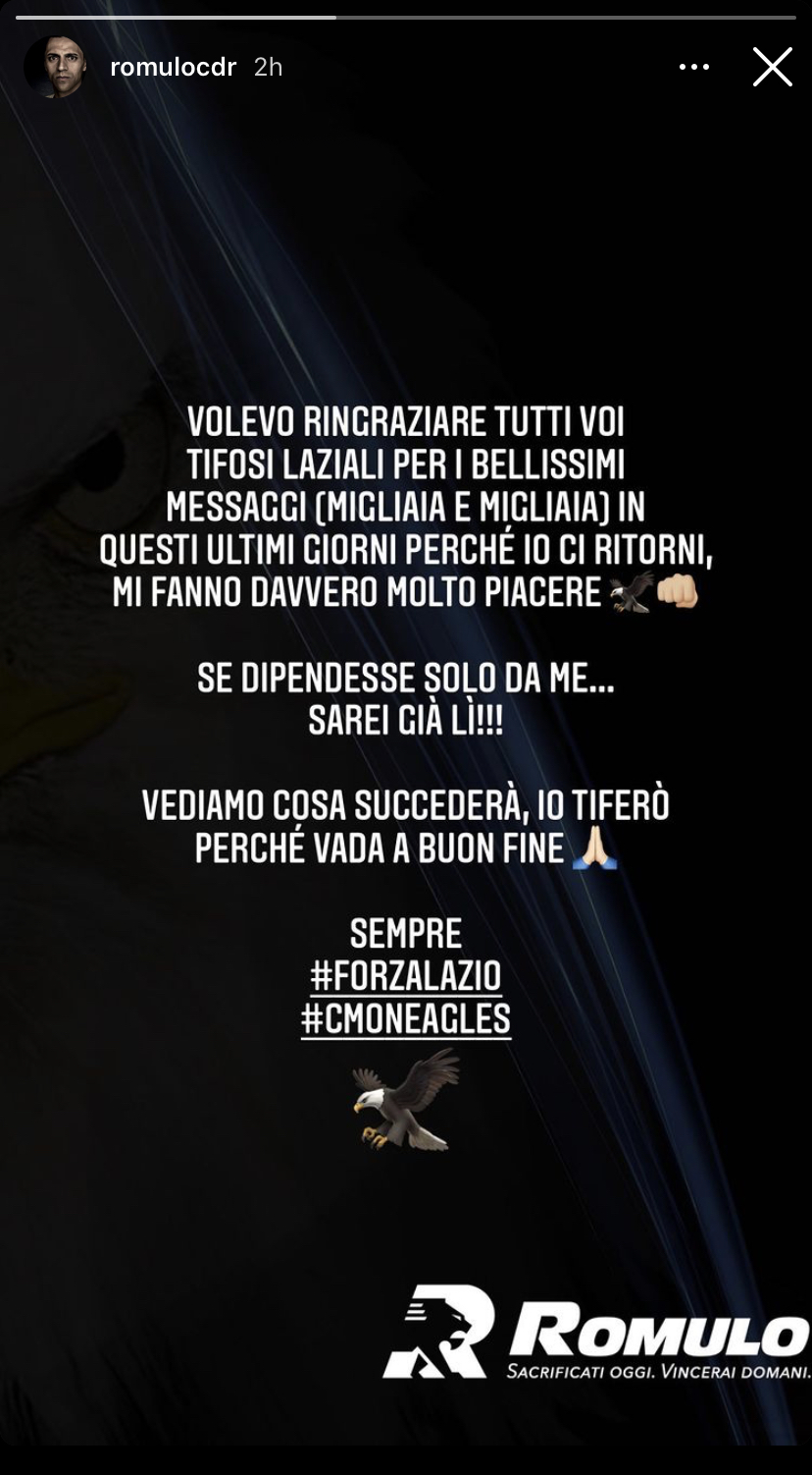 Tramite le proprie Instagram Stories, l'ex centrocampista della Fiorentina Romulo, svincolato, ha espresso il desiderio di tornare a vestire la maglia della Lazio. Ecco le sue parole: "Volevo ringraziare tutti voi tifosi laziali per i bellissimi messaggi in questi ultimi giorni affinché io ci ritorni, mi fanno davvero molto piacere. Se dipendesse solo da me... sarei già lì!".