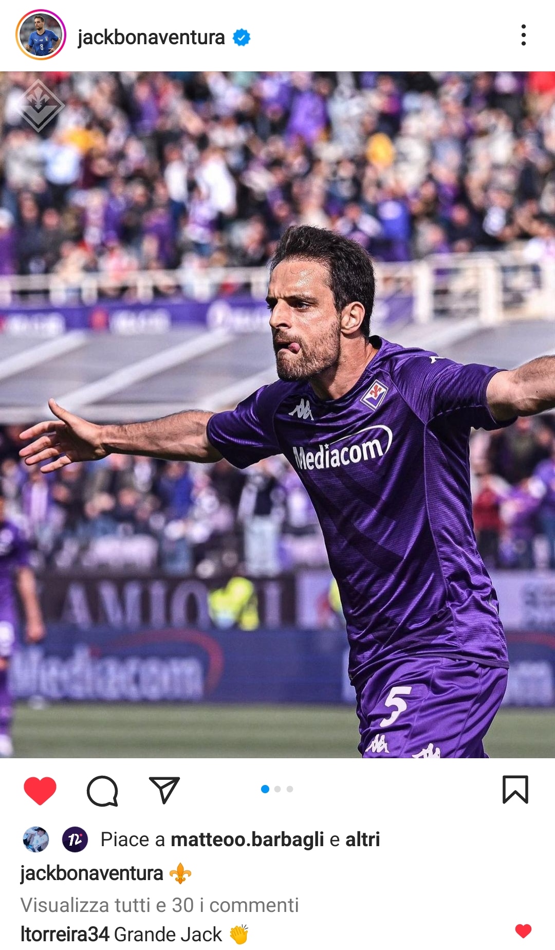 Attraverso il proprio profilo Instagram, Giacomo Bonaventura ha pubblicato una foto mentre esulta dopo la rete del 2-0 contro l'Udinese. Spicca il commento di Lucas Torreira, ex centrocampista Viola, che scrive: "Grande Jack".