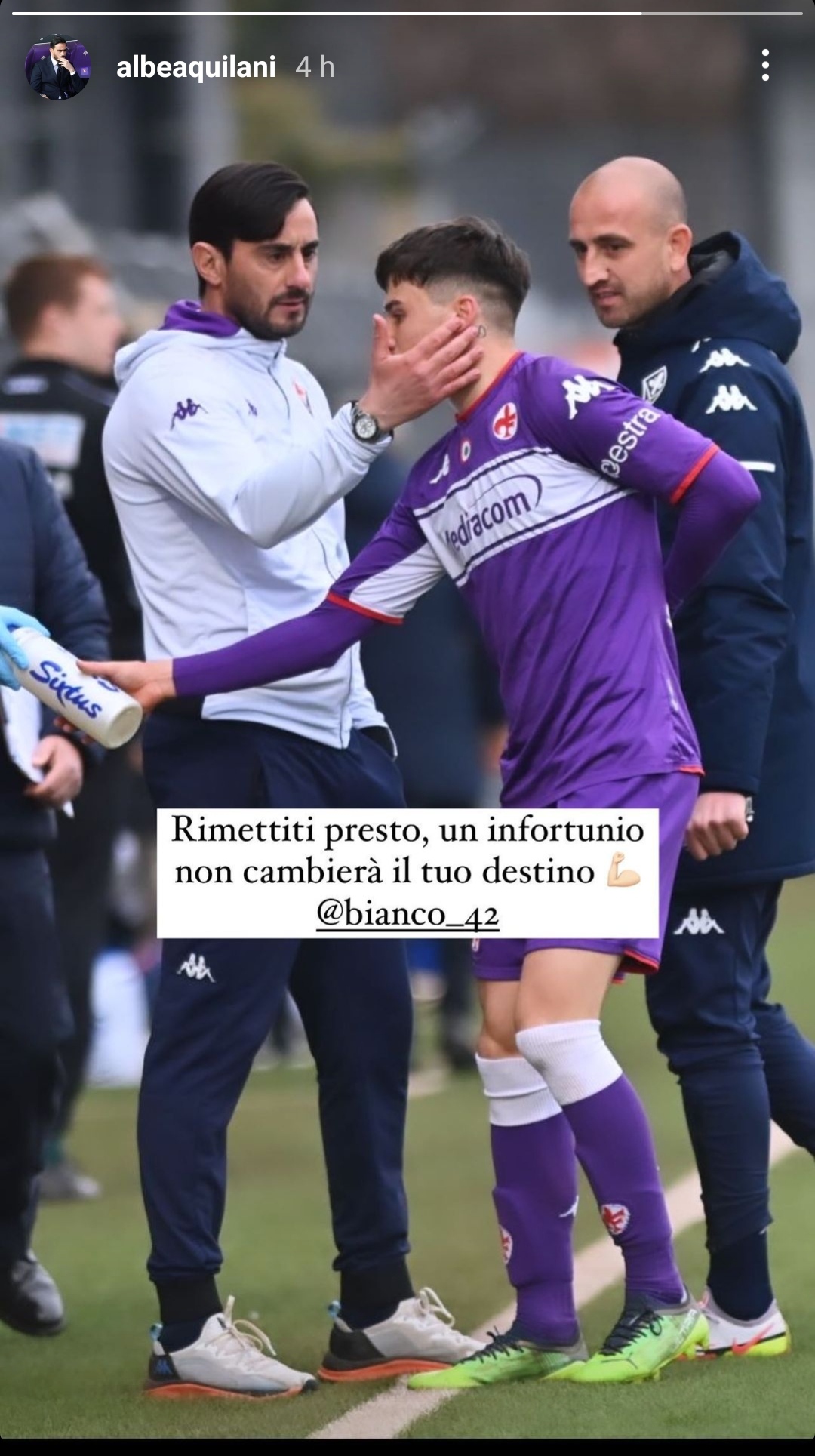 L'allenatore della formazione Primavera Alberto Aquilani ha pubblicato una storia Instagram per augurare una buona guarigione ad Alessandro Bianco, giovane gioiellino viola che ha subito un brutto infortunio alla spalla nella sfida contro il Bologna. Queste le sue parole parole sui social: "Rimettiti presto, un infortunio non cambierà il tuo destino".