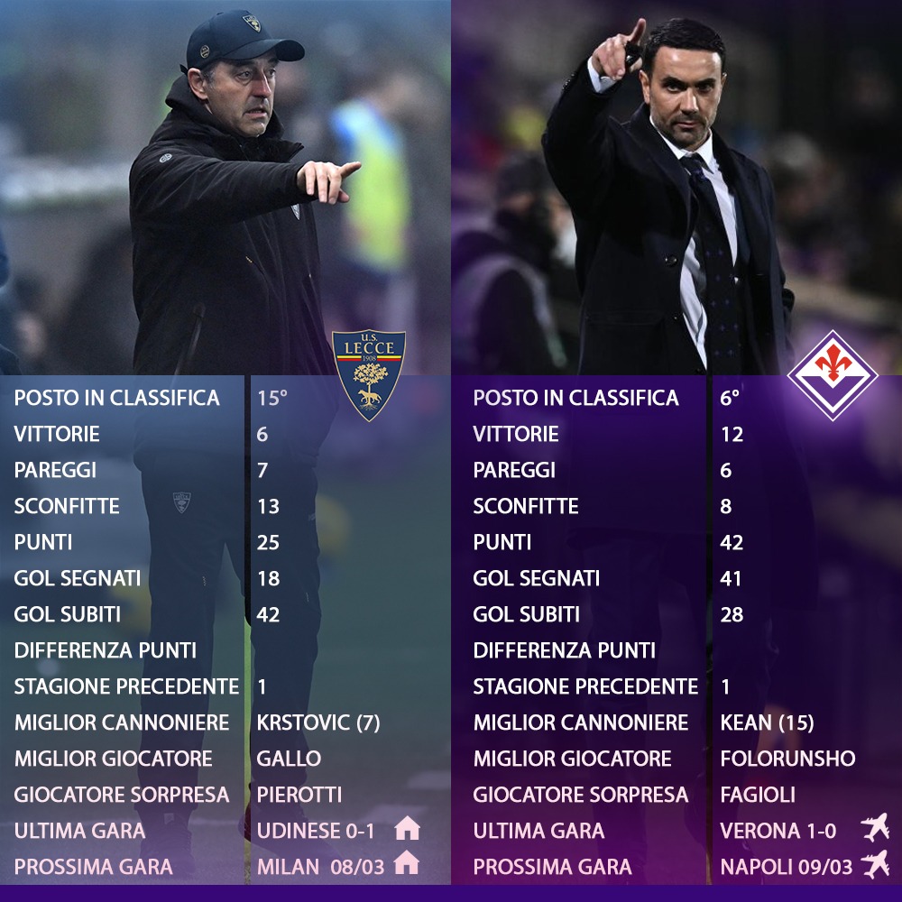 Giampaolo ha invertito la rotta, vincendo subito a Venezia e pareggiando in casa con la Juventus. Ha migliorato la media-punti del suo predecessore Gotti, dopo aver perso all’Olimpico contro la Roma ha vinto a Monza e poco dopo ha battuto anche l’Empoli al Castellani. Nelle ultime sei partite ha un po’ rallentato mettendo insieme solo 5 punti, ma vincendo un altro scontro diretto a Parma. Alla 12a giornata, quando è stato assunto il nuovo allenatore, il Lecce era terz’ultimo con 9 punti (media punti 0,75), adesso è 15° con 25 punti con una media di 1,06 ogni 90 minuti. E’ una squadra che attacca forte e bene con Gallo sulla sinistra, uno dei migliori terzini italiani di quella fascia, ha buona qualità con i due esterni Karlsson e Morente (Giampaolo ha anticipato l'assenza di Pierotti), mentre i sette gol di Krstovic (l’anno scorso, alla stessa giornata, ne aveva segnati due di meno) creano di sicuro qualche pensiero alla difesa di casa, fosse solo per il precedente: il primo gol in Serie A del centravanti montenegrino è arrivato proprio al Franchi, il 27 agosto 2023 (2-2 il risultato finale).