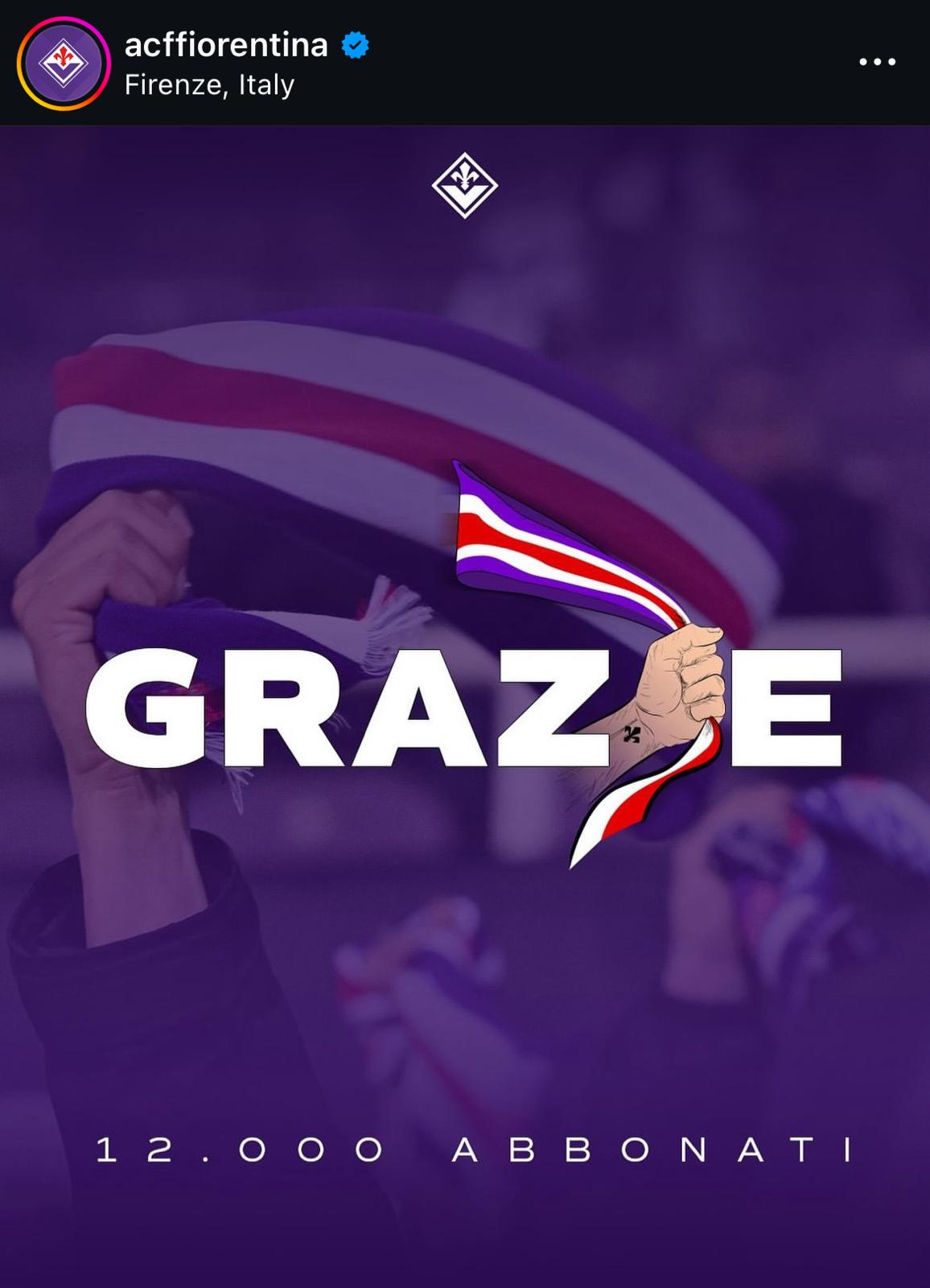 All'indomani della chiusura della campagna abbonamenti la Fiorentina ha pubblicato, sui propri canali social, un post di ringraziamenti ai tifosi viola dopo aver raggiunto quota 12mila tessere staccate. Questa l'immagine diffusa dal club di Rocco Commisso su Facebook: