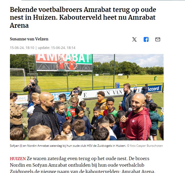 In attesa di novità sul proprio futuro, Sofyan Amrabat è stato nel weekend con il fratello Nordin nei campi che lo hanno visto crescere da bambino per un evento speciale. Come riporta il sito gooieneemlander.nl, l'HSV De Zuidvogels ha accolto i due giocatori con grande affetto, accerchiati dai tanti bambini accorsi ad acclamare il giocatore della Fiorentina e il fratello che gioca all'AEK Atene. Un campo sarà intitolato a Sofyan, l'altro a Nordin: d'ora in poi chi si allenerà nella squadra di Huizen, Paesi Bassi, giocherà alla Amrabat Arena.