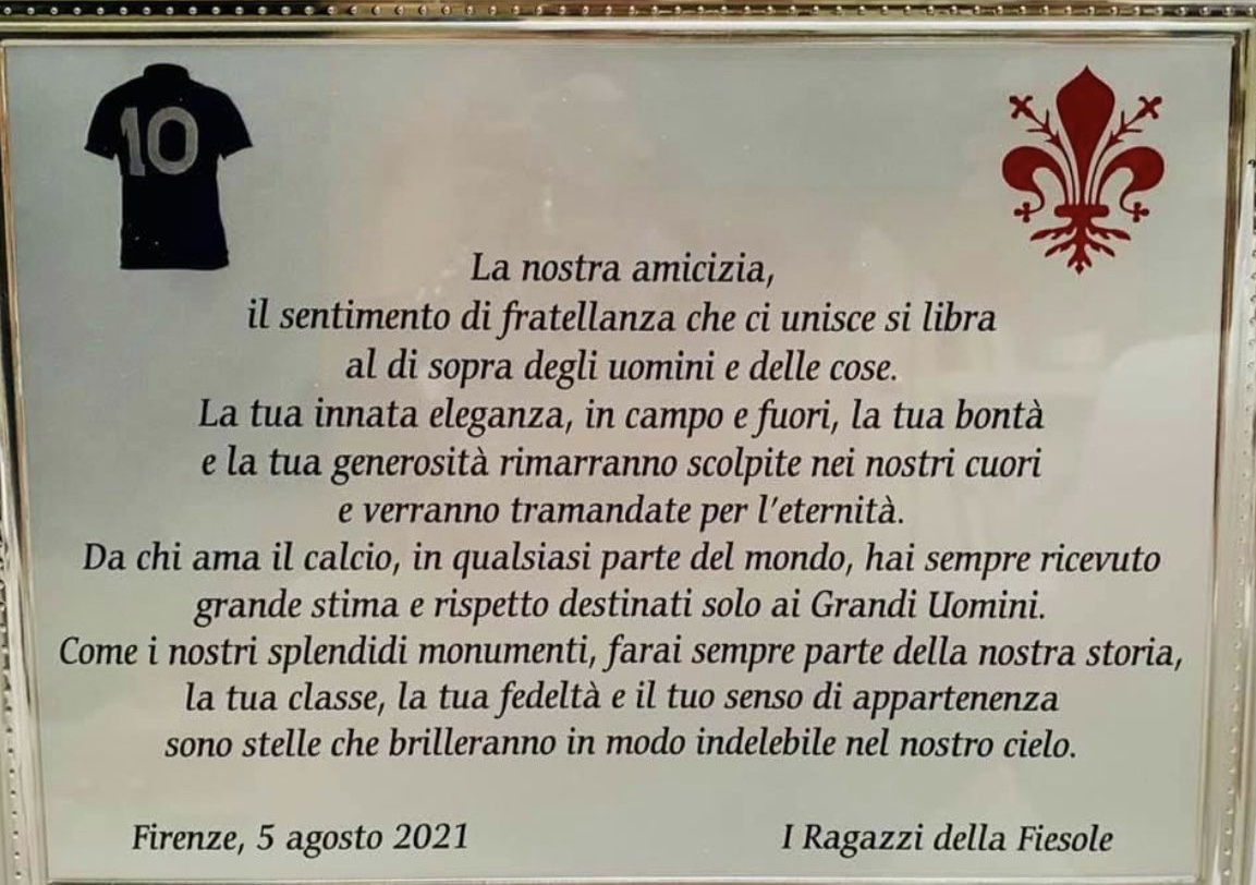 L'ex dirigente viola Giancarlo Antognoni ha pubblicato sui social una targa che ha ricevuto dai tifosi della Fiorentina: "La nostra amicizia, il sentimento di fratellanza che ci unisce si libra al di sopra degli uomini e delle cose. La tua innata eleganza, in campo e fuori, la tua bontà e la tua generosità rimarranno scolpite nei nostri cuori e verranno tramandate per l'eternità. Da chi ama il calcio, in qualsiasi parte del mondo, hai sempre ricevuto grande stima e rispetto destinati solo ai Grandi Uomini. Come i nostri splendidi monumenti, farai sempre parte della nostra storia, la tua classe, la tua fedeltà e il tuo senso di appartenenza sono stelle che brilleranno in modo indelebile nel nostro cielo", è quanto si legge sulla targhetta firmata "I ragazzi della Fiesole", accompagnata dalla didascalia "post muto" dell'Unico Dieci.
