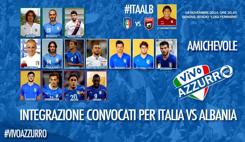 C'è anche il centrocampista viola Alberto Aquilani nella mini-rosa dei 14 azzurri che Antonio Conte ha deciso di convocare per l'amichevole di martedì prossimo tra l'Italia e l'Albania a Genova, dove saranno raccolti i fondi per gli alluvionati del capoluogo ligure. Oltre al numero 10 viola, Conte ha chiamato anche Acerbi, Bonucci, Rossettini, Antonelli, Criscito, De Silvestri, Maggio, Poli, Sturaro, Destro, Gabbiadini, Matri ed Okaka. Questo il tweet della Nazionale italiana coi nuovi azzurri: