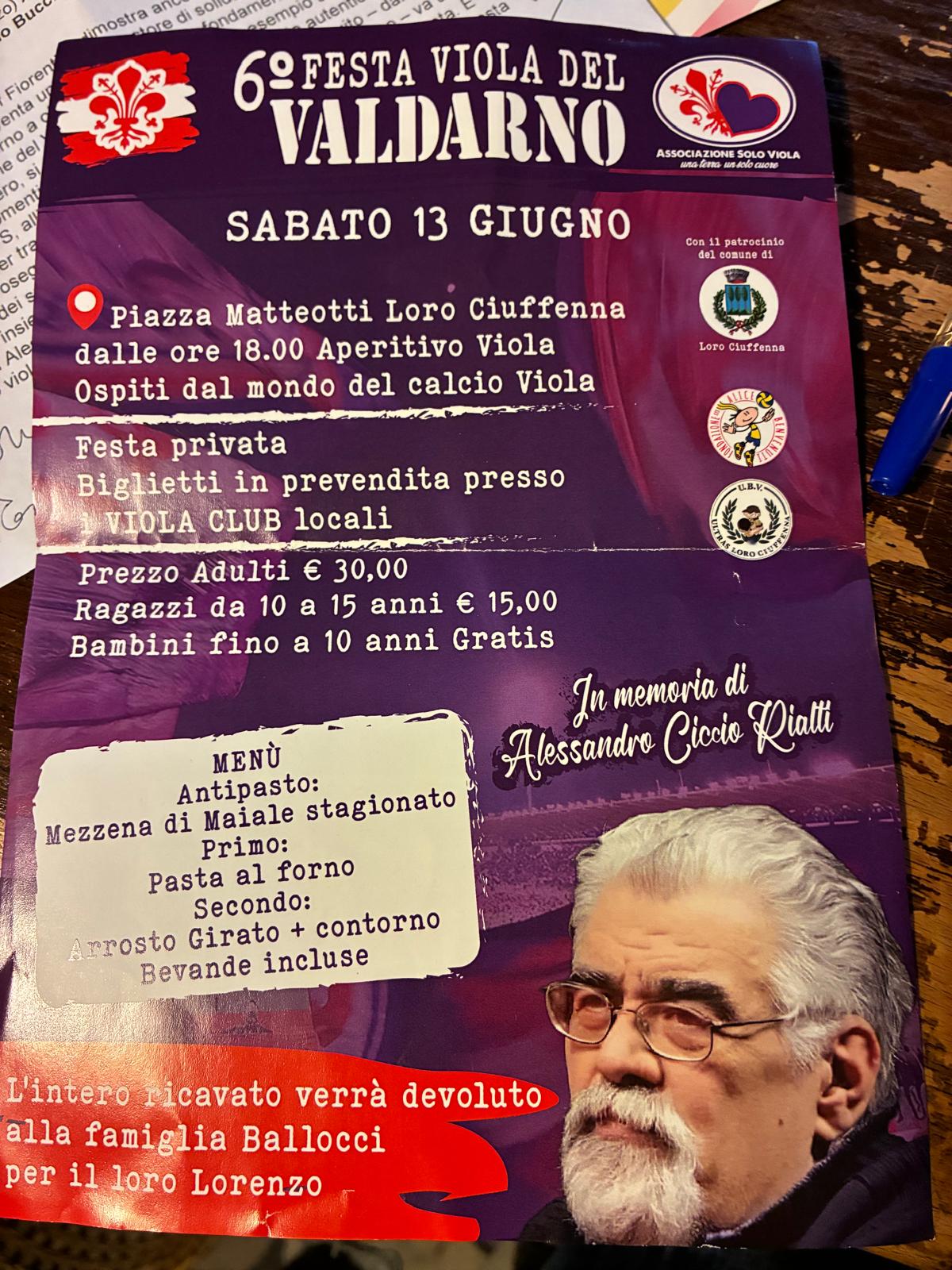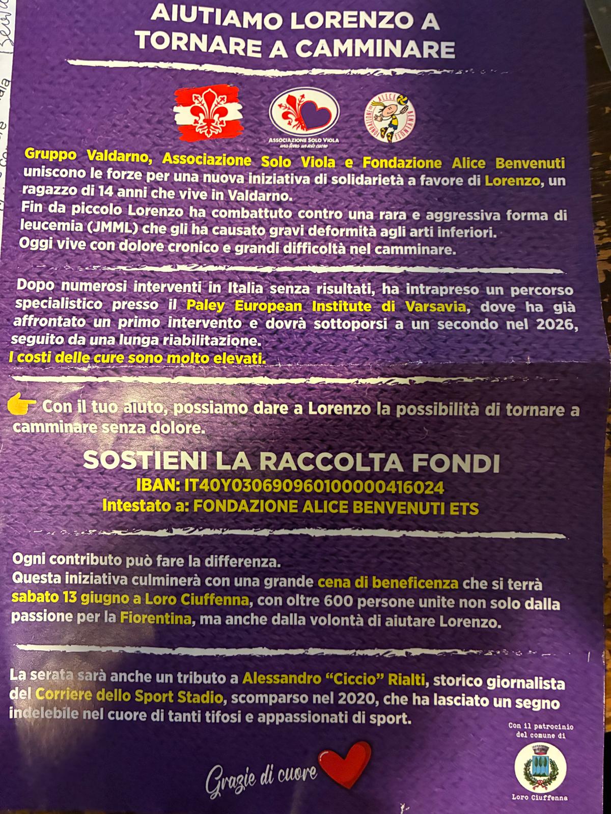 I primi risultati della campagna saranno resi noti in occasione di una grande cena di beneficenza che si terrà il 13 giugno a Loro Ciuffenna: per l’occasione, piazze e strade del paese si trasformeranno in un’unica grande tavolata che accoglierà oltre 500 persone, unite dal tifo per la Fiorentina e dalla volontà di aiutare. La serata sarà dedicata anche alla memoria di Alessandro Rialti.