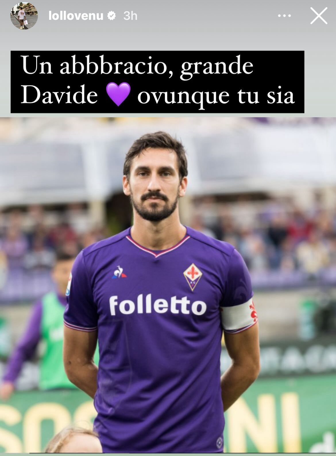 C'è stato poi anche German Pezzella, altro capitano della Fiorentina e suo compagno di reparto, che lo ha ricordato con la scritta "Davide" e due emoji del cuore viola e l'infinito e Borja Valero, che ha postato una foto che li ritraeva assieme. Anche Federico Chiesa, reduce dal gol al Maradona ieri sera, ha pubblicato su Instagram un ricordo: "Davide sempre con noi". Infine è stato il turno del grande amico Riccardo Saponara, che ha messo la storia della canzone Terra degli Uomini di Jovanotti (che fu usata come base del video tributo in suo onore) con la scritta "6 anni".