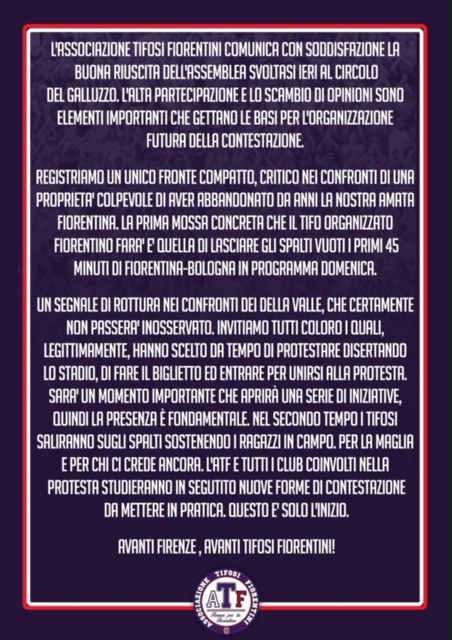 Durissima presa di posizione dell'ATF al termine della riunione organizzata ieri dall'associazione dei tifosi fiorentini alla luce dei recenti accadimenti all'interno della società viola. Come comunicato attraverso una nota, il tifo organizzato lascerà gli spalti vuoti dello stadio per tutti i primi 45' del derby dell'Appennino contro il Bologna di domenica in segno di protesta. Ecco, nella foto sottostante, il comunicato completo che annuncia peraltro nuove iniziative di contestazione: