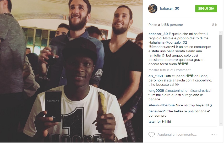L'attaccante della Fiorentina Khouma Babacar ha postato sul proprio profilo Instagram una foto della cena di squadra andata in scena ieri sera, come raccontatovi da FirenzeViola.it (LEGGI QUI). Nel post, il senegalese ringrazia capitan Gonzalo per un regalo di Natale anticipato e senza dubbio curioso. Dedica e ringraziamenti anche per Mario Suarez, che ha contribuito - scrive Baba - alla "bella serata in famiglia". Un'unione, quella dello spogliatoio viola, che continua quindi a distinguersi dentro e fuori dal campo.