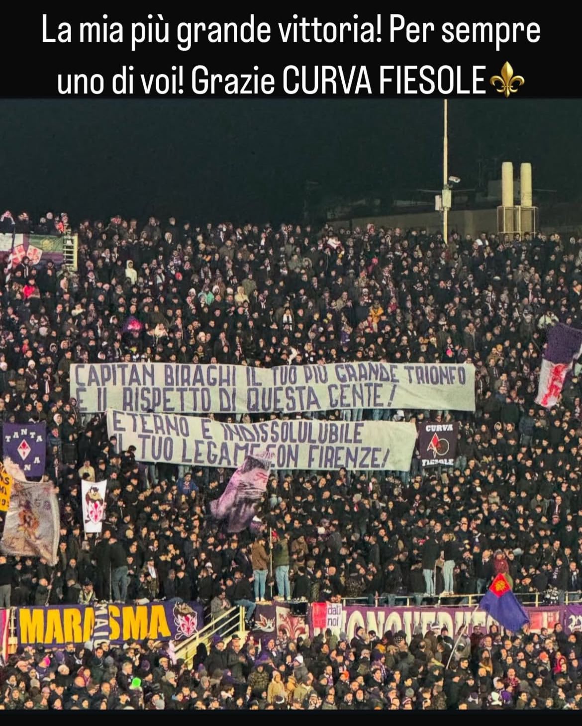 Intorno all’ora di gioco tra Fiorentina e Inter la Curva Fiesole ha omaggiato l’ex capitano viola Cristiano Biraghi - passato al Torino nell’ultima sessione di mercato - con uno striscione che recitava: “Capitan Biraghi il tuo più grande trionfio è il rispetto di questa gente! Eterno e indissolubile il tuo legame con Firenze”. Immediata la risposta di Biraghi che, attraverso una storia Instagram, ha scritto: "La mia più grande vittoria! Per sempre uno di voi! Grazie CURVA FIESOLE!".