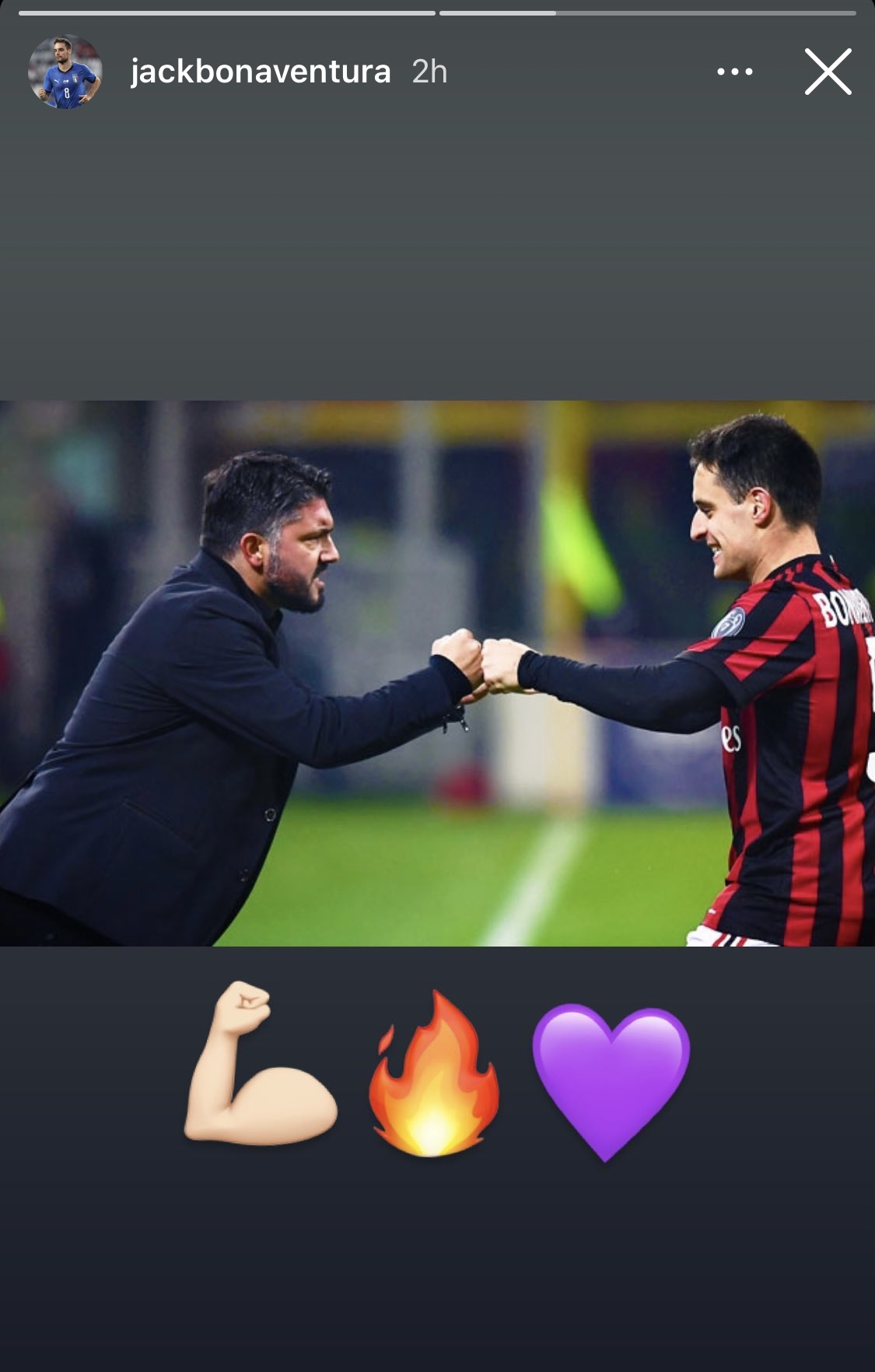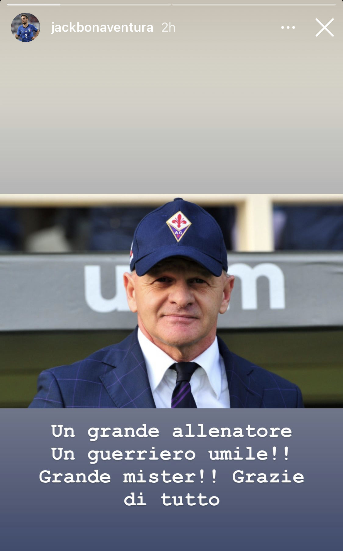Sulle stories del proprio account ufficiale Instagram, Giacomo Bonavenura ha postato due foto che ritraggono Beppe Iachini nella prima e Gennaro Gattuso nella seconda. Il centrocampista viola ha voluto ringraziare il tecnico ascolano scrivendo "un grande allenatore, un guerriero umile!! Grande mister! Grazie di tutto". Mentre l'immagine successiva raffigura lui stesso che si scambia un cenno d'intesa con Rino Gattuso ai tempi del Milan. Qui sotto le due foto.