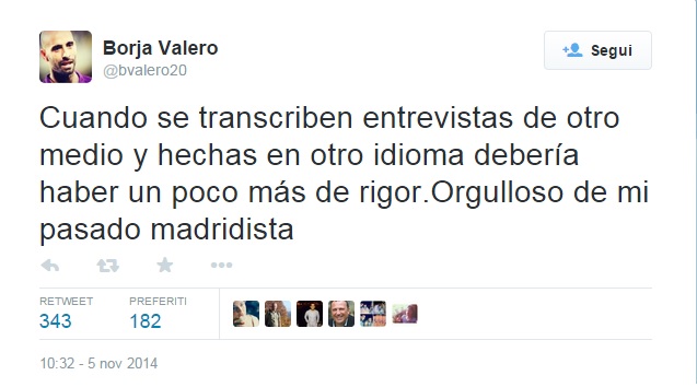 Dopo aver rilasciato un'intervista al mensile francese So Foot, il centrocampista della Fiorentina Borja Valero non pare aver gradito la traduzione che è stata fatta delle sue parole dalla stampa (LEGGI QUI), pubblicando un post sul suo profilo Twitter in cui si dichiara pienamente orgoglioso del suo passato con la maglia del Real Madrid, a differenza di ciò che poteva trapelare in quanto letto nei giorni passati. Questo, nelle specifico, il tweet del numero 20 viola tradotto in italiano: "Quando si trascrivono interviste di altri mezzi e realizzate in un'altra lingua ci dovrebbe essere un po' più di rigore. Orgoglioso del mio passato madridista".