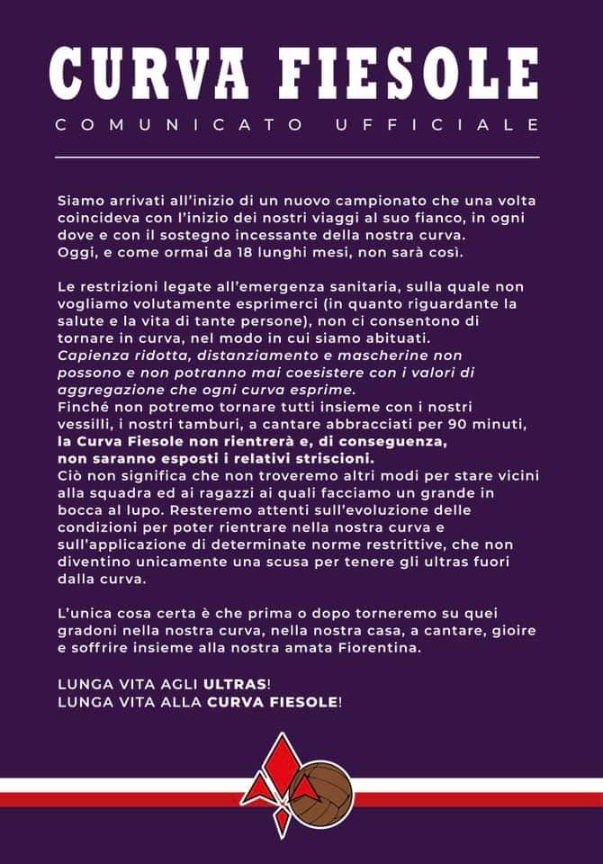 Finché non potremo tornare tutti insieme con i nostri vessilli, i nostri tamburi, a cantare abbracciati per 90 minuti, la Curva Fiesole non rientrerà e, di conseguenza, non saranno esposti i relativi striscioni.