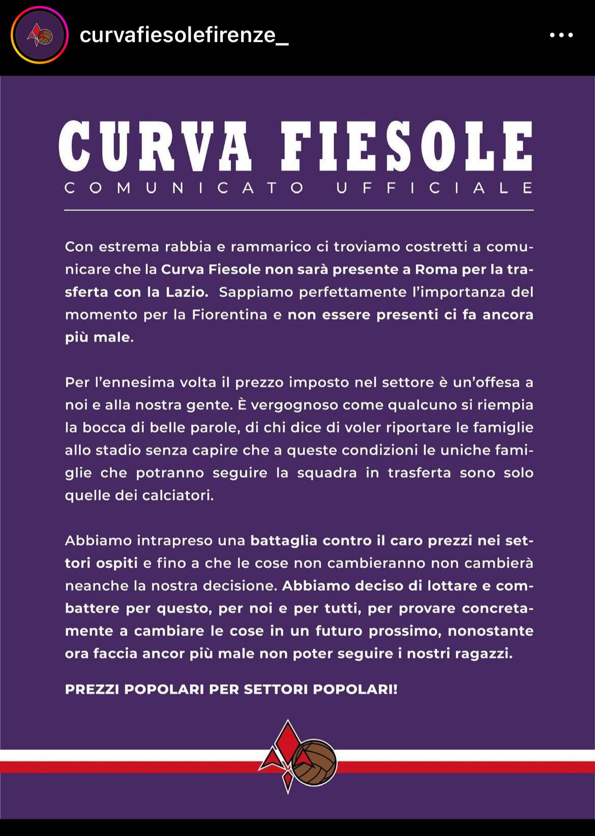 Per l'ennesima volta il prezzo imposto nel settore è un'offesa a noi e alla nostra gente. È vergognoso come qualcuno si riempia la bocca di belle parole, di chi dice di voler riportare le famiglie allo stadio senza capire che a queste condizioni le uniche famiglie che potranno seguire la squadra in trasferta sono solo quelle dei calciatori.