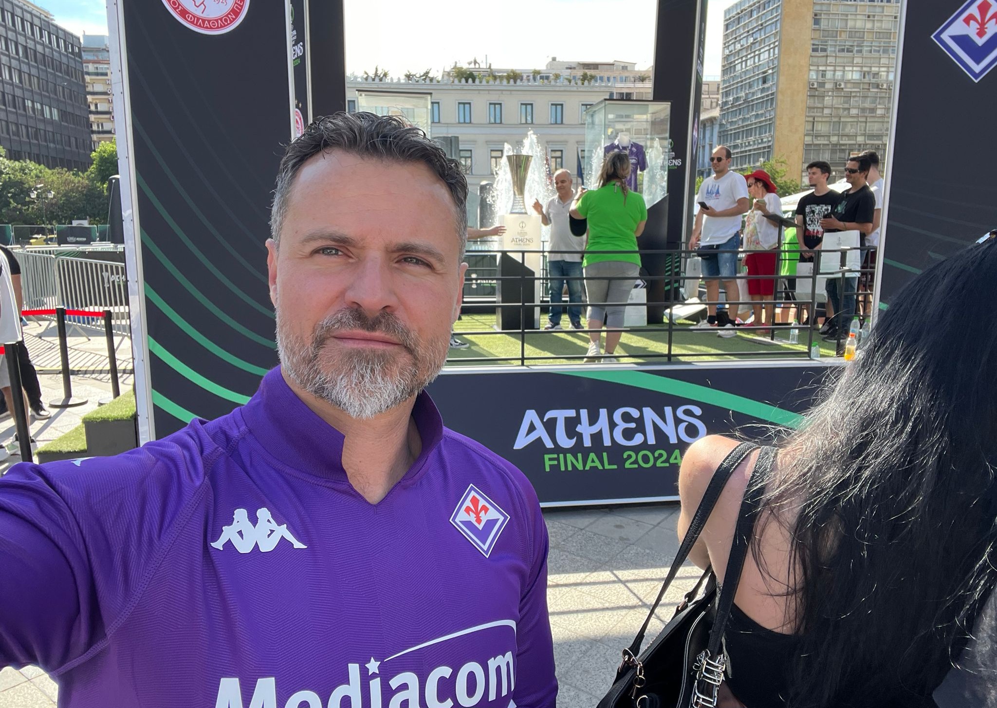 Questa sera all'OPAP Arena di Atene la Fiorenitna affronterà l'Olympiacos nella finale di Conference League. Tra gli oltre 9.000 sostenitori viola presenti nella capitale greca anche il Sindaco di Bagno A Ripoli Francesco Casini che ha deciso di seguire da tifoso la partita. Queste le immagini del primo cittadino del comune dove sorge il Viola Park: