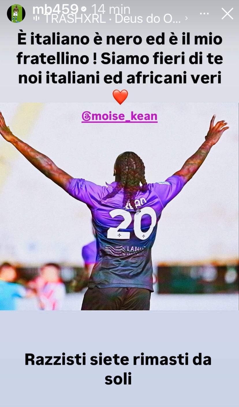 Continua l'ondata di solidarietà del movimento calcistico italiano nei confronti di Moise Kean, vittima di alcuni insulti razzisti sui social dopo Inter-Fiorentina. A dimostrare la propria vicinanza verso l'attaccante viola anche Mario Balotelli, attualmente al Genoa, che ha pubblicato poco fa una storia col seguente messaggio: "E' italiano e nero ed è il mio fratellino! Siamo fieri di te noi italia ed africani veri! Razzisti siete rimasti soli" ha scritto Balotelli, allegando una foto del collega. Vicinanza espressa anche da Marcus Thuram, ieri in campo da avversario di Kean ma a suo fianco nella lotta al razzismo: "Chosen One" ha scritto l'attaccante dell'Inter, pubblicando una foto dell'amico e riferendosi al nome del disco appena pubblicato da KMB.