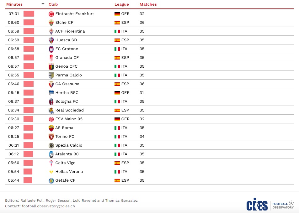 La Fiorentina fa parte delle dieci squadre italiane che sono in graduatoria e si piazza al diciottesimo posto tra tutte le formazioni europee (decima tra le sole italiane: le altre sono Verona, Atalanta, Spezia, Torino, Roma, Bologna, Parma, Genoa e Crotone). Ai viola viene fischiato un fallo a sfavore in media ogni 6 minuti e 59 secondi in ogni partita. Ecco le classifica nel dettaglio delle squadre più fallose d'Europa: