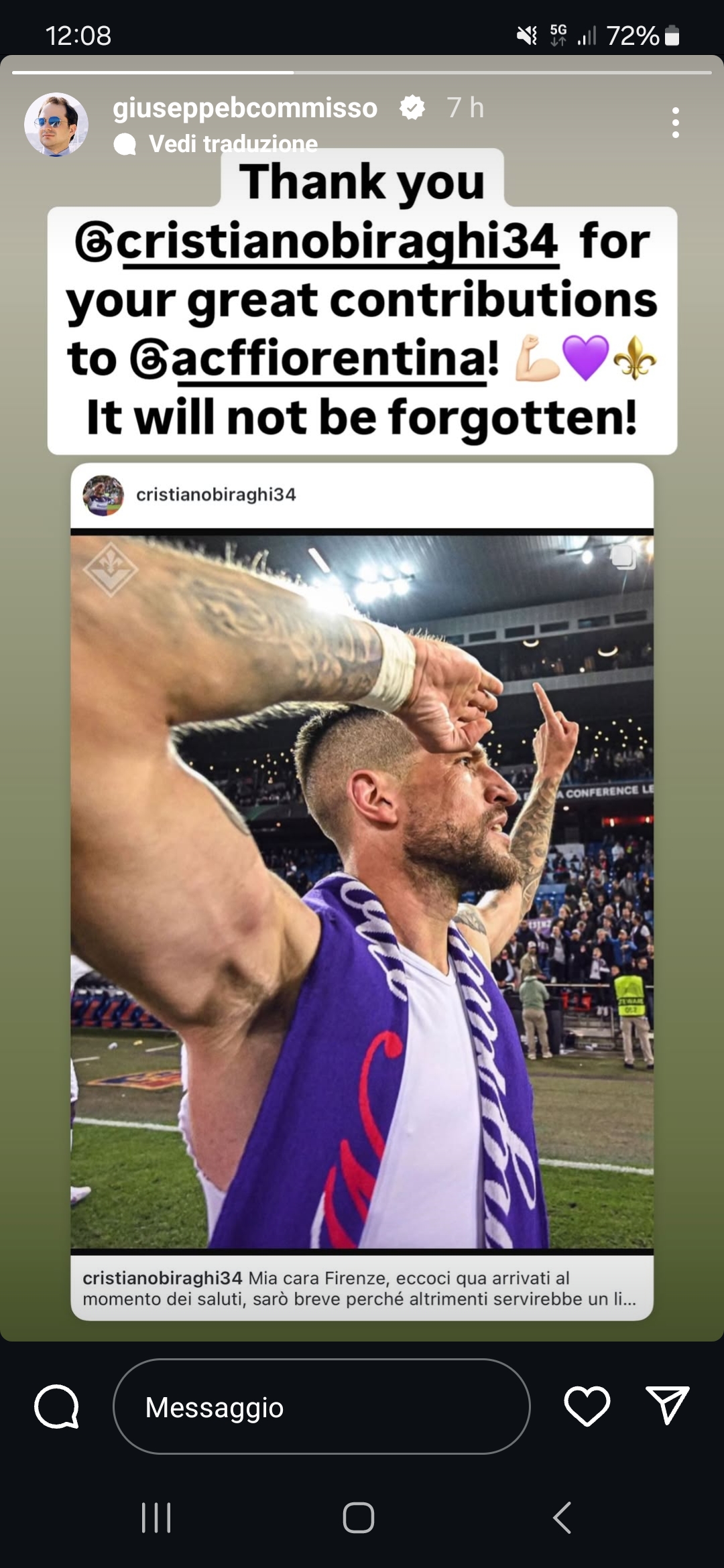Tra i saluti arrivati a Cristiano Biraghi dopo la lettera con cui l'ex capitano della Fiorentina ha salutato Firenze e il club viola, c'è stato anche quello di Joseph Commisso, figlio del presidente gigliato. Il primogenito del patron di Mediacom sui propri social ha ricondiviso il saluto di Biraghi e ha scritto: "Grazie Cristiano per il tuo grande contributo alla Fiorentina. Non dimenticheremo quello che hai fatto".