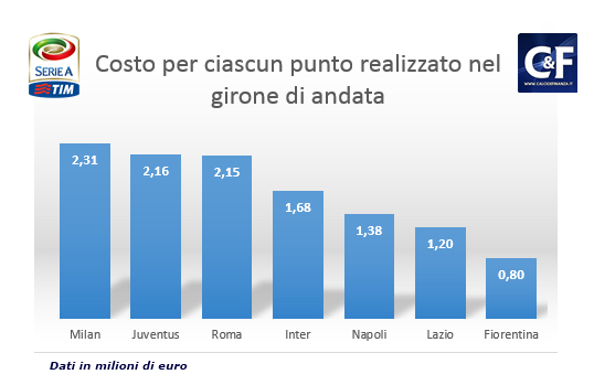 Il sito calcioefinanza.it ha provato ad analizzare quanto possa costare in termini economici ogni punto per i maggiori club di Serie A, studiando il rapporto tra la spesa effettuata (stipendi, ammortamenti e costo prestiti) e i punti realizzati nel girone d’andata del campionato 2015/16 delle sette “big”, cioè Napoli, Juventus, Inter, Fiorentina, Roma, Milan e Lazio. Iniziando dagli stipendi (al lordo), una prima classifica vede in testa la Juventus, con 60,8 milioni, seguita da Roma (56,5), Milan (52), Inter (46,7), Napoli (36,6), Lazio (25,3) e Fiorentina (22,2). Discorso simile per quanto riguarda gli ammortamenti e le spese per i prestiti: sempre la Juventus davanti a tutti a quota 23,6 milioni, poi troviamo Napoli (19,9), Inter (18,8), Roma (16,7), Milan (15), Fiorentina (8,1) e Lazio (7). Chi ha messo più soldi per la prima parte di stagione è quindi la Juventus, il cui costo della rosa ha toccato quota 84,4 milioni. A seguire Roma (73,2), Milan (67), Inter (65,5), Napoli (56,5), Lazio (32,3) e Fiorentina (30,2).