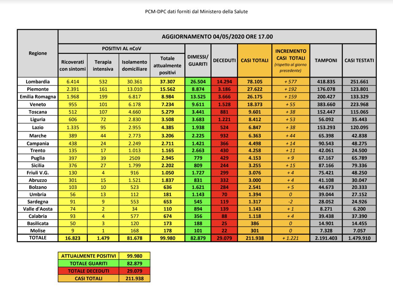 COVID-19, Bollettino Italia: i casi del 4 maggio